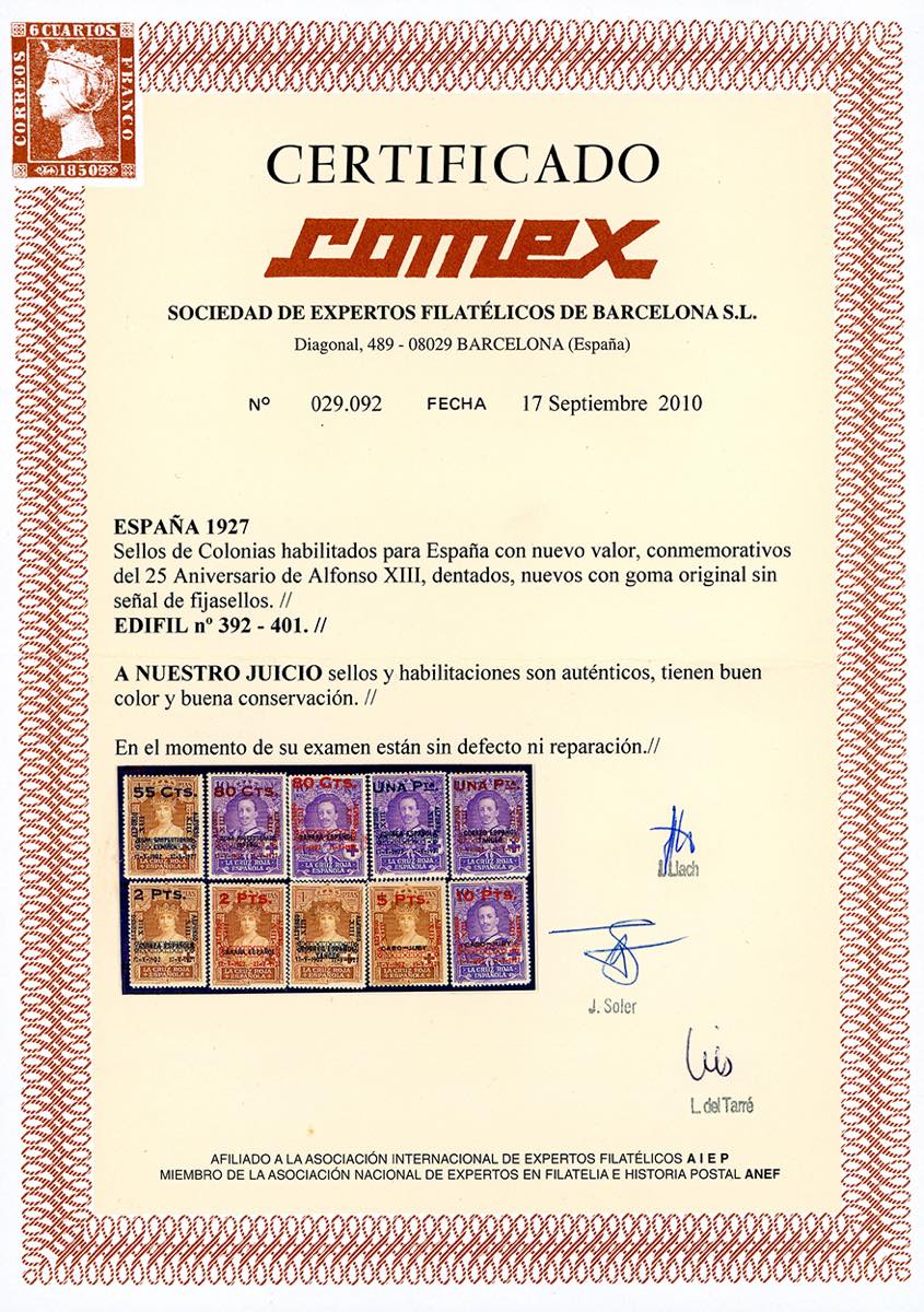 SPAGNA 1927 - Emissioni delle colonie soprastampate Alfonso XIII, serie competa (329/338), gomma originale integra, perfetti e di ottima qualità. Cert. Comex. Ex coll. Romano.
