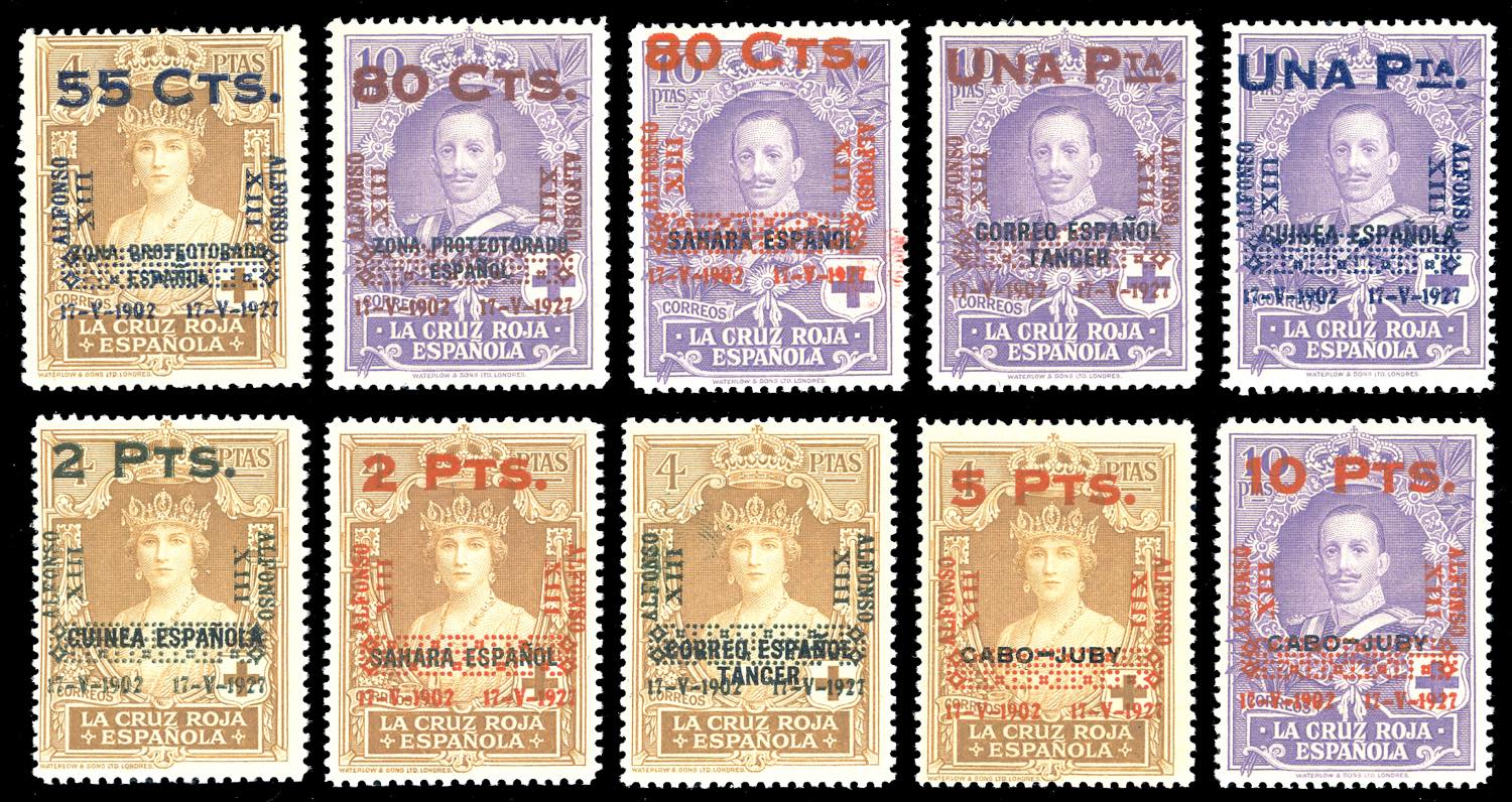 SPAGNA 1927 - Emissioni delle colonie soprastampate Alfonso XIII, serie competa (329/338), gomma originale integra, perfetti e di ottima ... Read more
