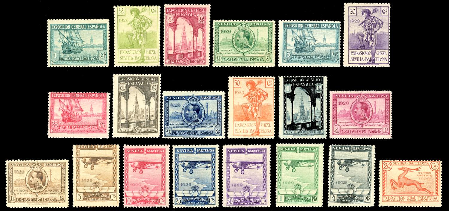 SPAGNA 1929 - Esposizione di Siviglia e di Barcellona, serie complete di posta ordinaria, aerea ed espresso, dentellature miste (367/379,A31/A36,E4), gomma originale integra, perfetti. Ex coll. Romano.