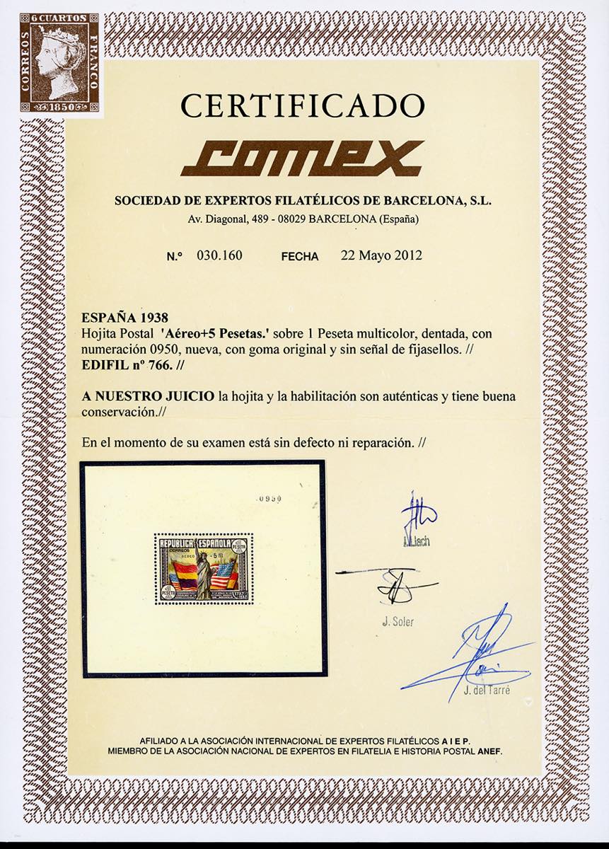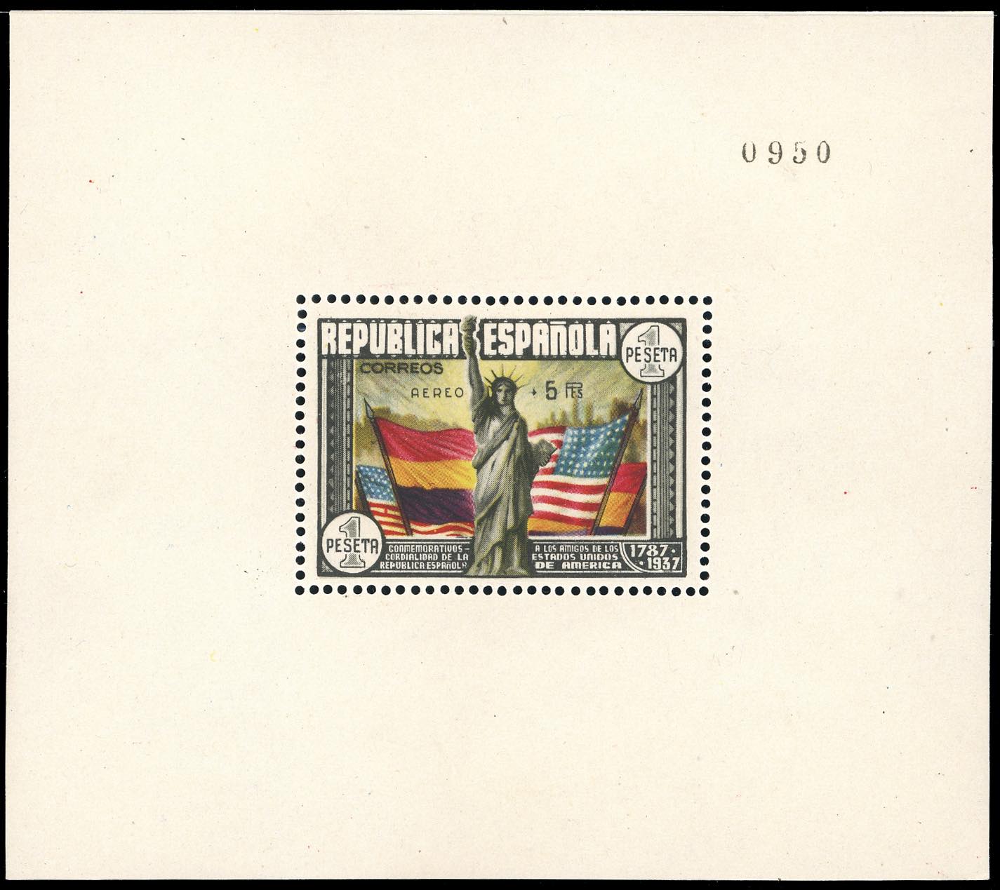 SPAGNA FOGLIETTI POSTA AEREA 1938 - + 5 p. su 1 p. Stati Uniti, foglietto (BF9), gomma originale integra, perfetto. Cert. Comex. Ex coll. ... Read more