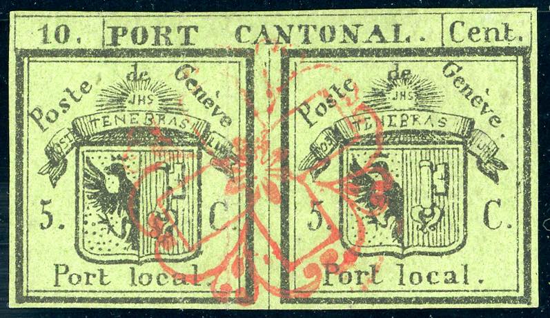 SVIZZERA CANTONALI 1843 - 5 + 5 cent. verde, Doppio di Ginevra (1), usato, ben marginato, annullo centrale. Molto fresco, invisibile ed impercettibile lieve piega. Grande varietà. A. Diena, Emilio Diena. Cert. Marchand.