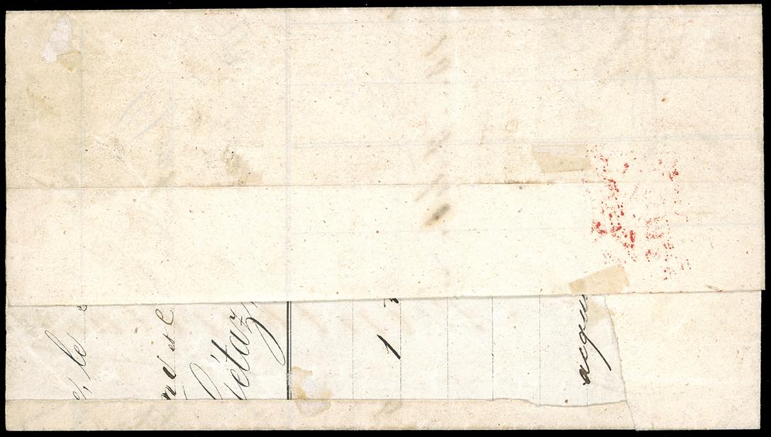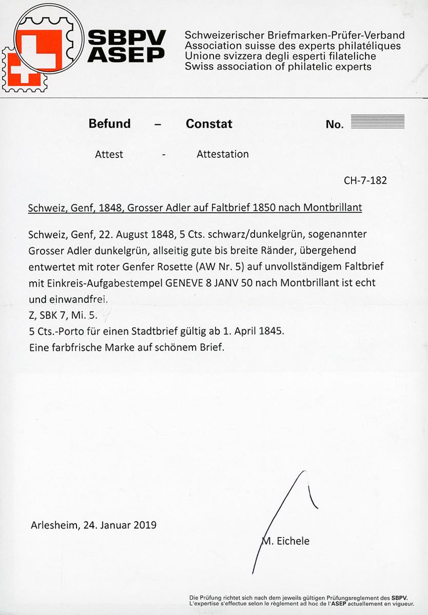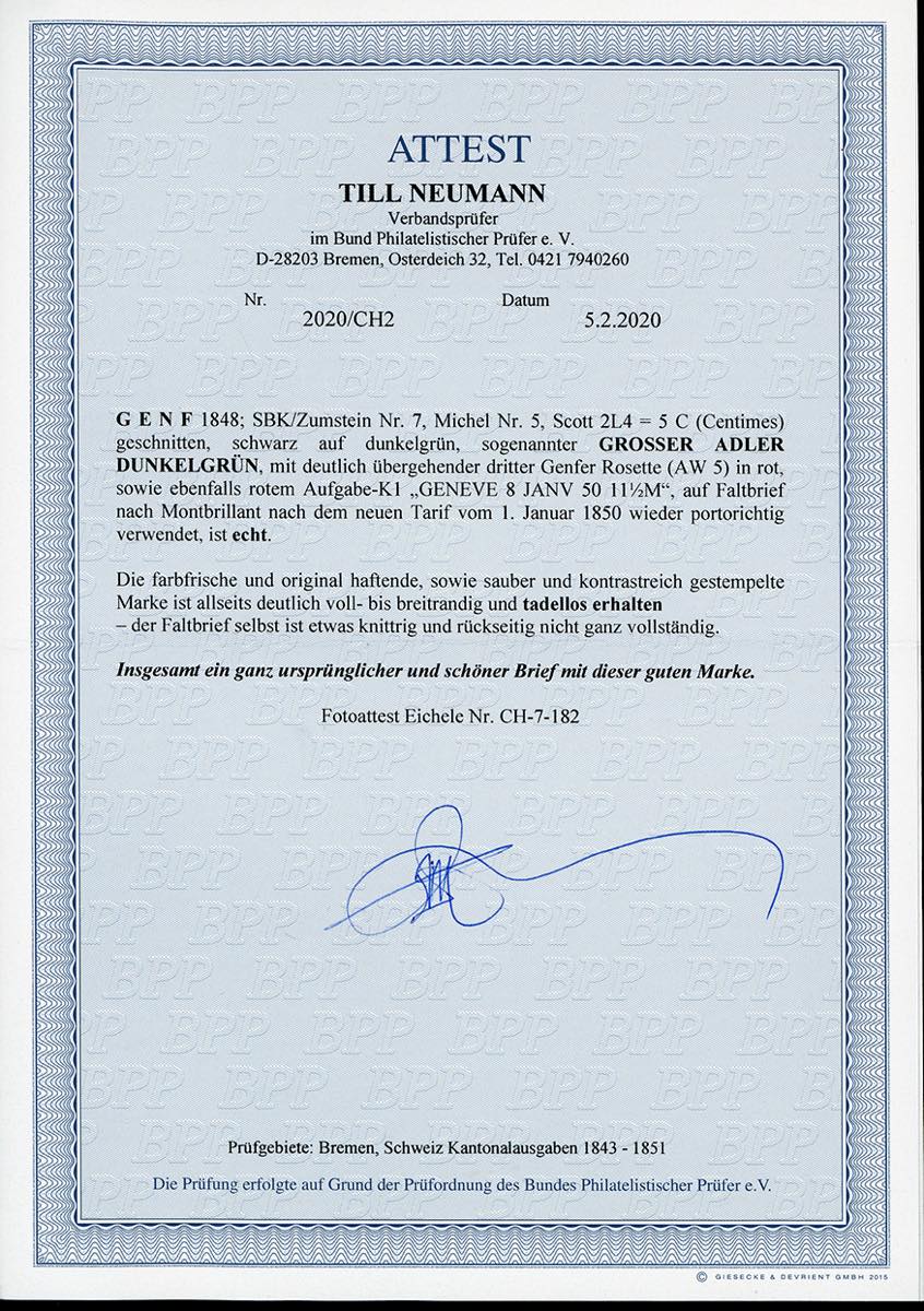 SVIZZERA CANTONALI 1850 - 5 cent. verde scuro Aquila grande di Ginevra (3A), perfetto e ben marginato, su lettera, parzialmente incompleta al verso, da Ginevra 8/1/1850 a Montbrillant. Bellissima. Cert. Eichele e Neumann.