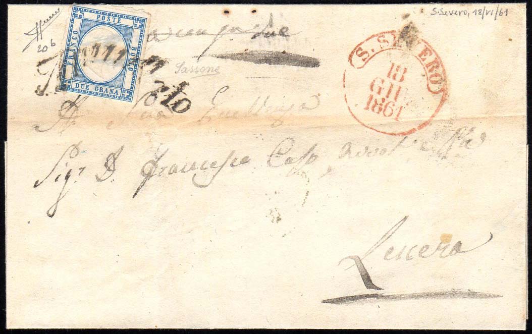 SAN SEVERO, svolazzo + cerchio rosso punti R1 - 2 grana (20b), perfetto, su sovracoperta di lettera del 18/6/1861 per Lucera. Raro! Sassone, cert. Sorani.