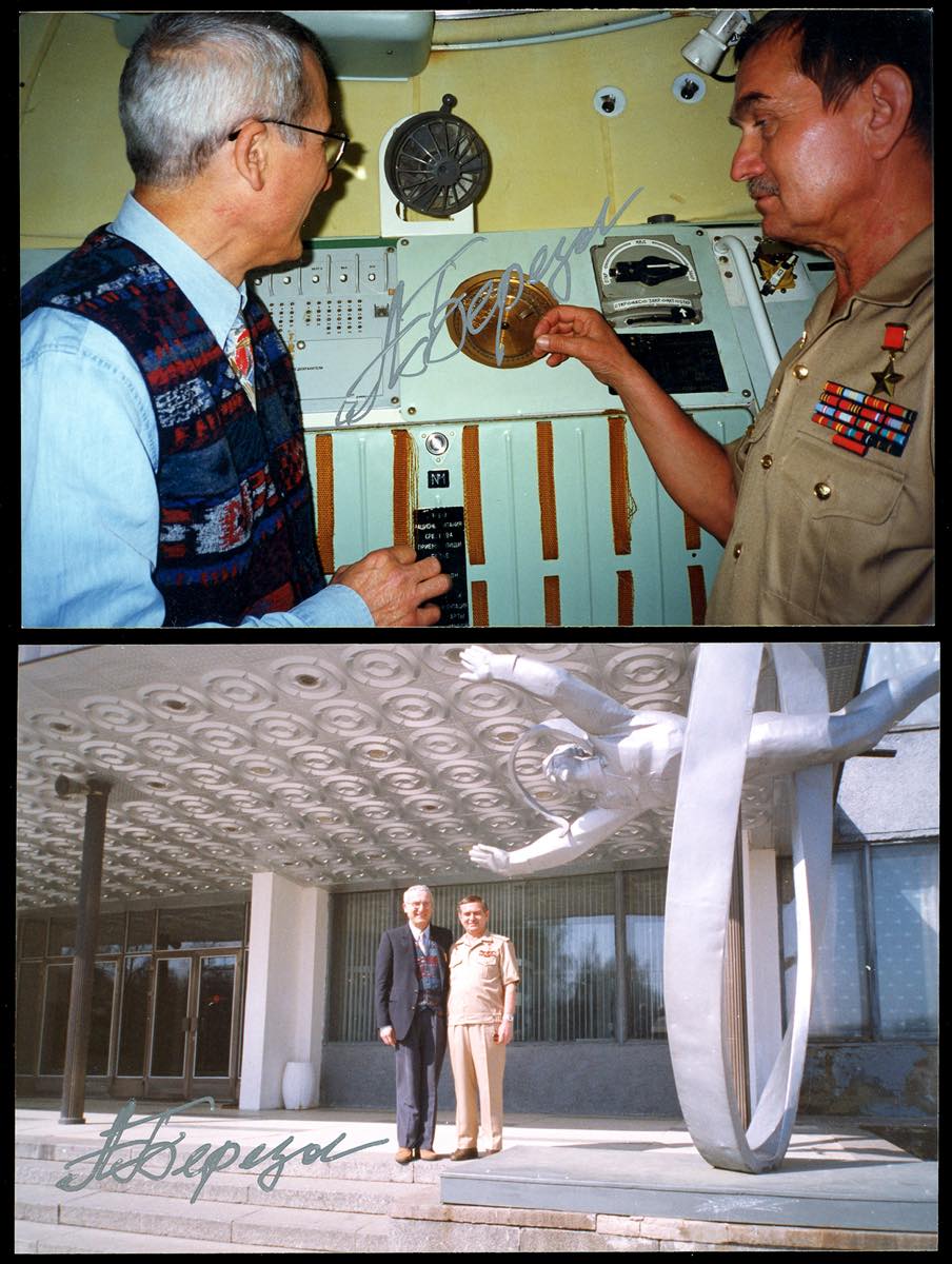 SPAZIO RUSSIA 1990/2000 - Due fotografie dell'astronauta Anatoli Berezovoy a Città delle Stelle, una all'entrata del Museo della Cosmonautica, una nel simulatore della navicella spaziale SOYUZ TM, entrambe con il suo auotgrafo.