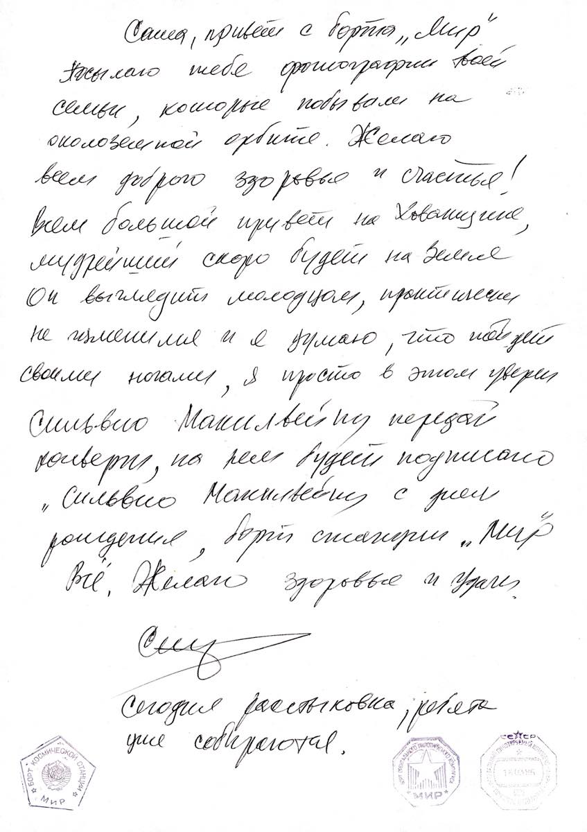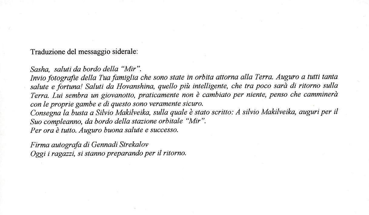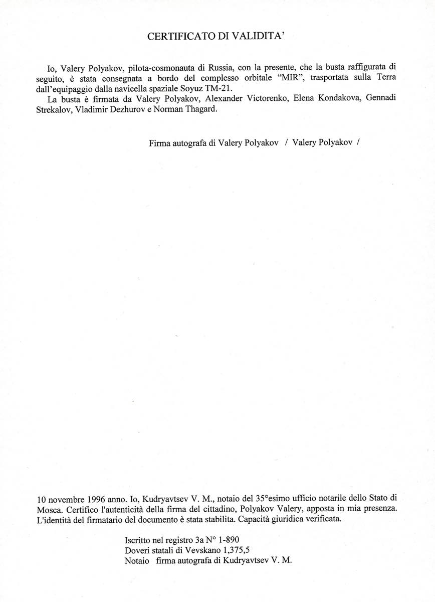 SPAZIO RUSSIA 1995 - Cosmogramma Spazio-Terra con testo interno scritto dalla stazione orbitale MIR 16/3/1995 dall'astronauta G.Strekalov al collega A.N.Balandin, bolli pentagonale ed ottagonale della stazione impressi in rosso. La busta è stata autografata dagli astronauti V.Poliakov, A.Victoranko, H.Kondakova, V.Dezhurov, G.Strekalov e N.Thagard, primo americano a raggiungere la stazione a bordo di un vettore russo, la SOYUZ TM-21. Il cosmogramma è stato trasportato sulla Terra dalla navicella SOYUZ TM-20. UNO DEI QUATTRO COSMOGRAMMI NOTI. Allegato certificato notarile, con relativa traduzione in italiano, e traduzione della lettera.