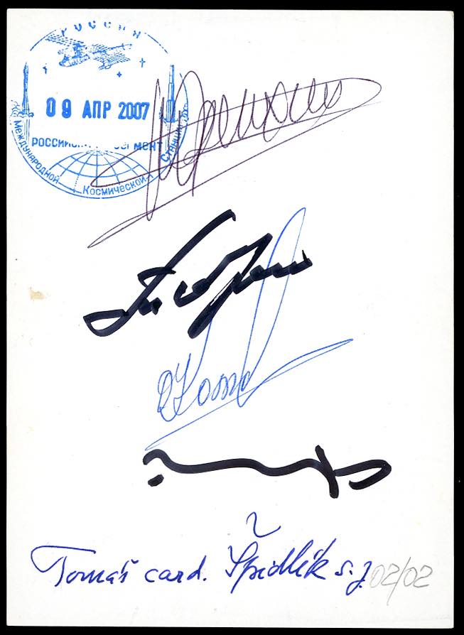 SPAZIO RUSSIA 2007 - Immagine religiosa trasportata dalla navicella SOYUZ TMA-10 con annullo del 9/4/2007, giorno di aggancio con la stazione spaziale I.S.S., con gli autografi di M.Tyrin, O.Kotv, F.Yurchikhin e C.Simonyi. Sono note 16 tipologie differenti di queste immagini sacre; questa è una delle due note con questo soggetto.