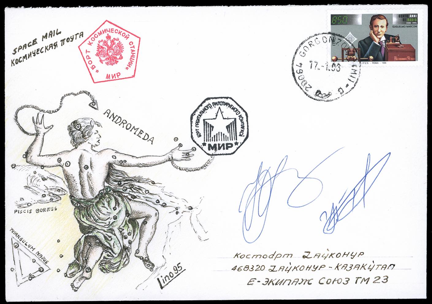 SPAZIO RUSSIA-ITALIA 1996 - Cosmogramma Terra-Spazio, partito dall'Italia affrancato con 850 lire Radio annullato a Gorgonzola 17/1996 ed indirizzato al comandante della SOYUZ TM-23. Sul fronte il bollo pentagonale e quello ottagonale in uso a bordo della stazione orbitante MIR e le firme degli astronauti Y.Onufrienko e Y.Usachev. Uno dei dieci esemplari noti.