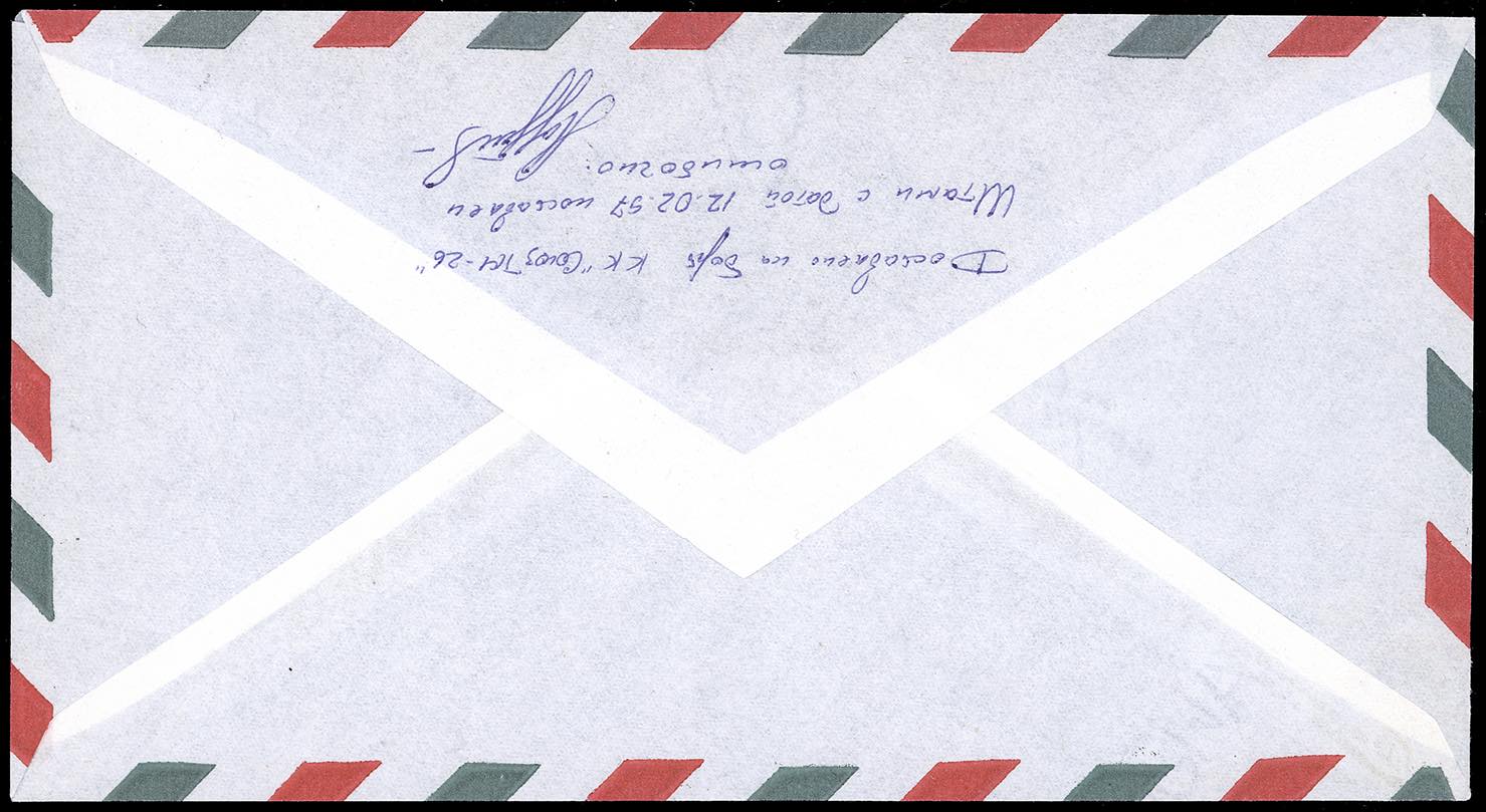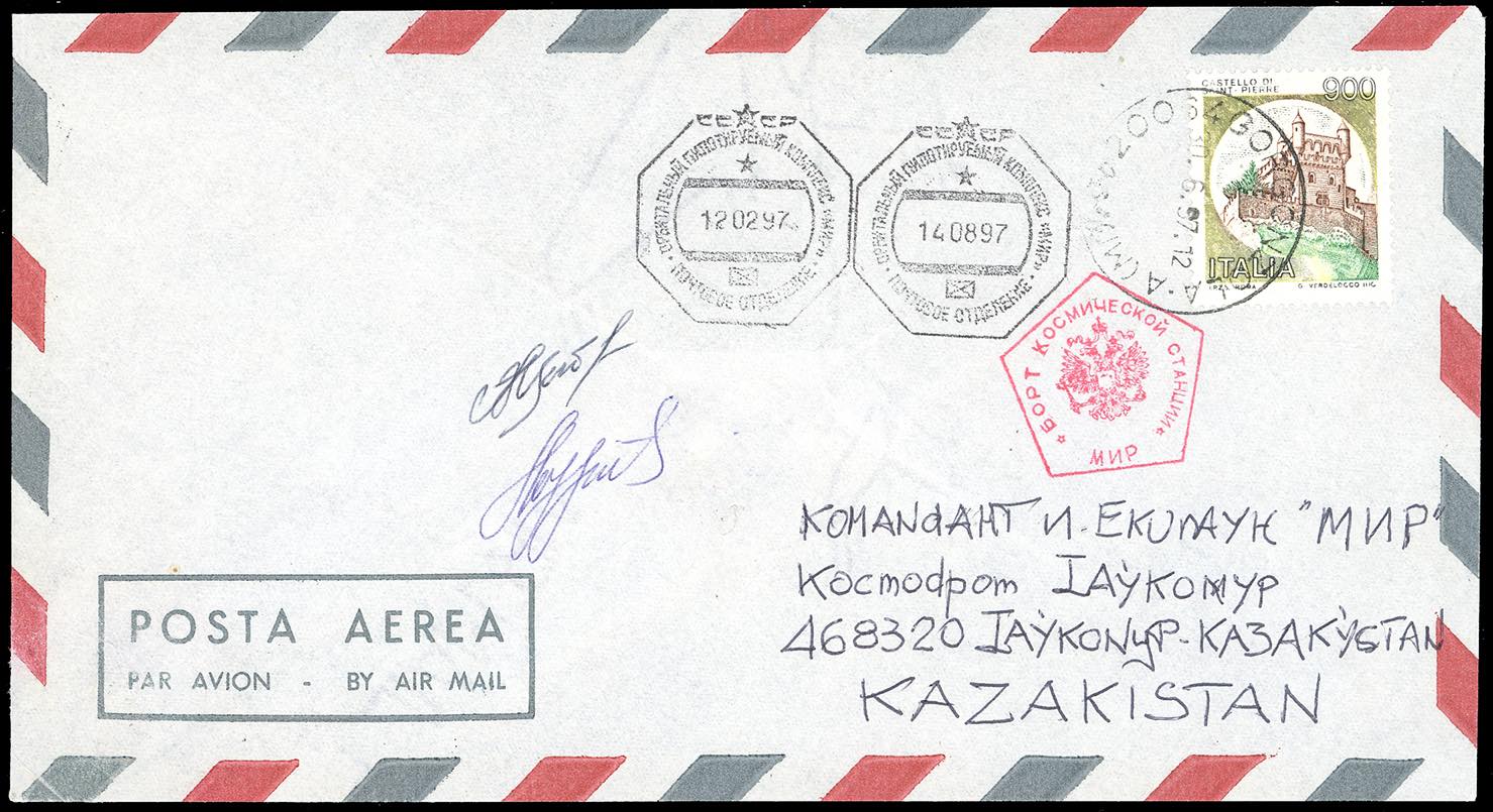 SPAZIO RUSSIA-ITALIA 1997 - Cosmogramma Terra-Spazio, partito dall'Italia, affrancato con 900 lire Castelli annullato a Gorgonzola 30/6/1997 e trasportato a bordo della stazione orbitante MIR, bollo pentagonale in rosso, e datari dei giorni di aggancio e di distacco della navicella spaziale SOYUZ. La busta è stata autografata dagli astronauti V.Tsibliyev e A.Lazutkin. Al verso dichiarazione autografa "Trasportato a bordo della navicella spaziale SOYUZ TM-26. L'annullo con data 12/2/1997 è stato eseguito erroneamente A.Lazutkin". Si tratta del primo cosmogramma dall'Italia con il datario ottagonale ufficiale in dotazione alla MIR (con errore di datario, come da dichiarazione autografa). UNO DEI SEI ESEMPLARI NOTI.
