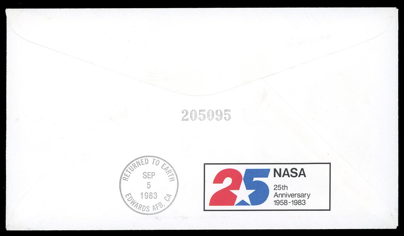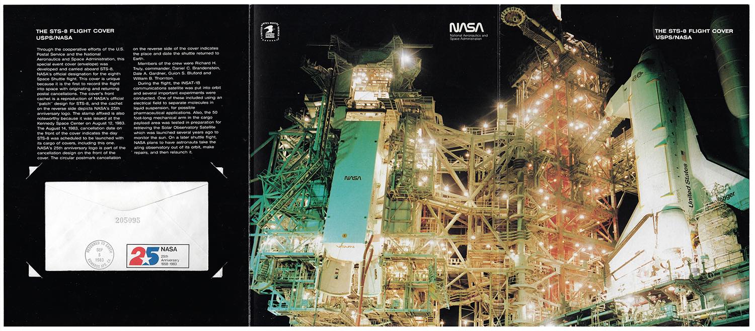 SPAZIO USA 1983 - Cosmogramma SHUTTLE STS-8 CHALLANGER, busta n. 205095, con gli annulli del 25° anniversario della NASA e del 30/8/1983, primo trasporto postale ufficiale nello Spazio, bollo di arrivo sulla Terra del 5/9/1983 al verso, in folder speciale.