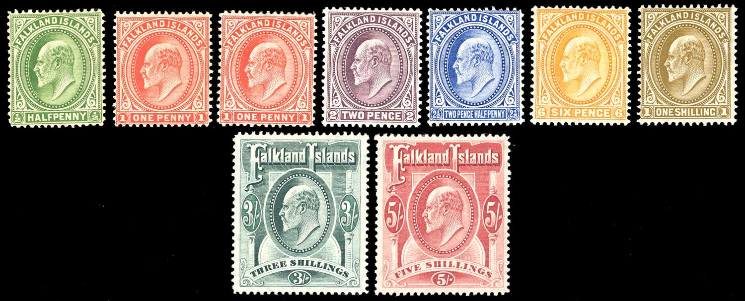 BRITISH COLONIES-FALKLAND ISLAND 1904 - Edoardo VII, serie completa (SG 43/50, £ 475), gomma originale, MLH, perfetti.