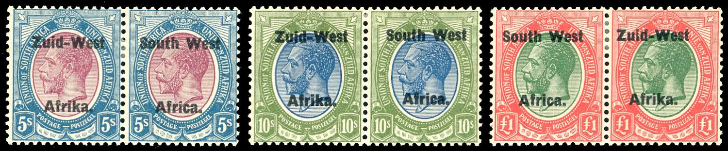 BRITISH COLONIES-SOUTH WEST AFRICA 1923 - 5 s., 10 s., 1 £, coppie orizzontali con i due tipi di soprastampa, distanza di 10 mm. tra le ... Read more