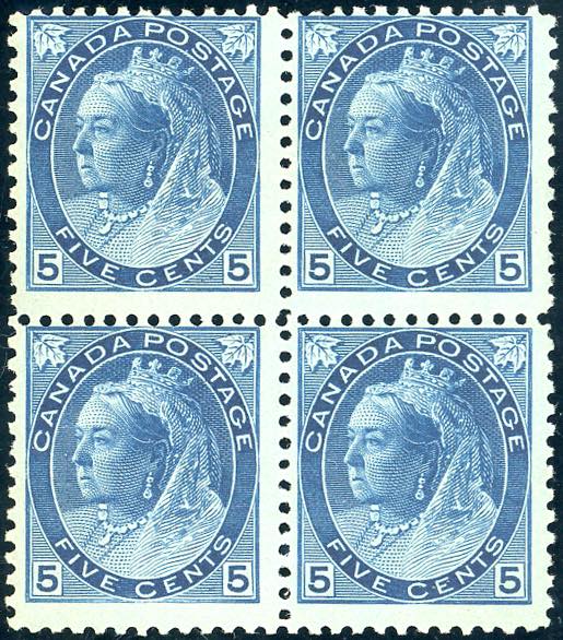 CANADA 1898/1903 - 5 cent. azzurro su carta azzurra Victoria (Yv.67), blocco di quattro nuovo, gomma originale, integra su i due esemplari inferiori, MLH x 2, MNH x 2, perfetto. Ottima qualità.