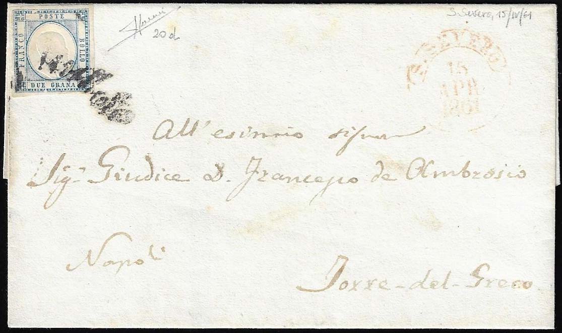 SAN SEVERO, svolazzo + cerchio rosso punti R1 - 2 grana (20d), perfetto, su sovracoperta di lettera del 15/4/1861 a Torre del Greco. Molto ... Read more