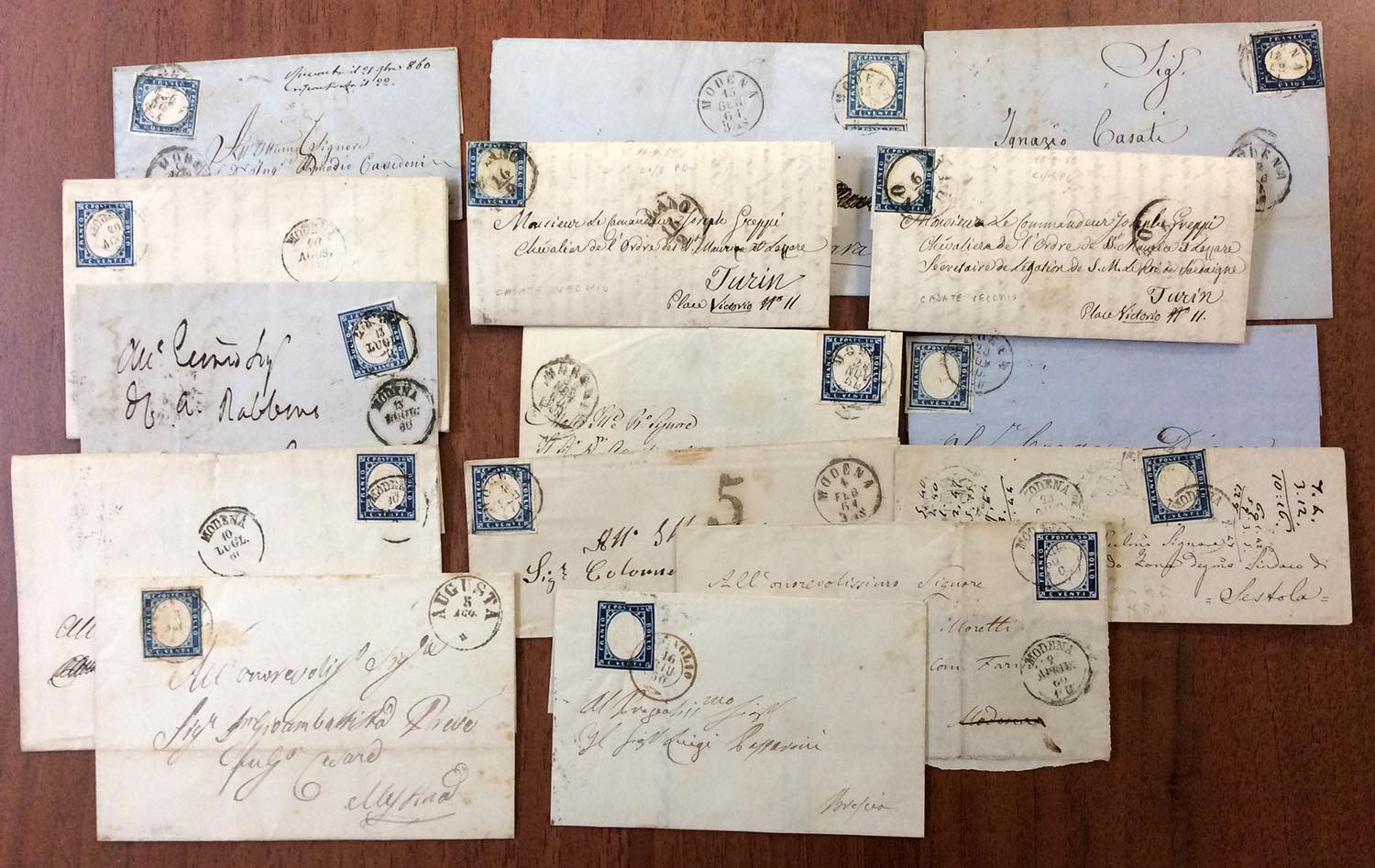 SARDEGNA 1860/1861 - Quattordici lettere affrancate con 20 cent. della IV emissione di Sardegna, con buona varietà di tinte del periodo.