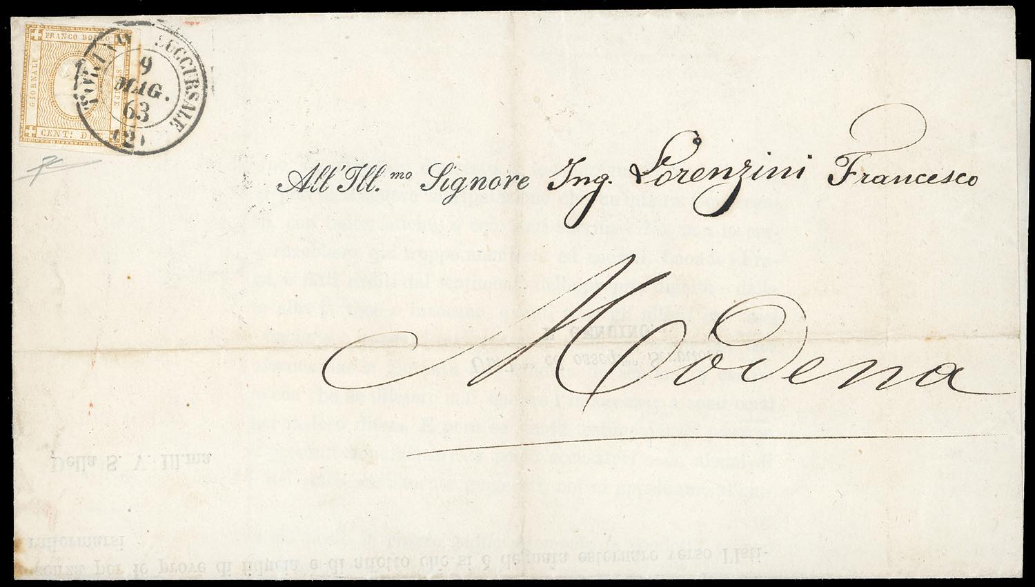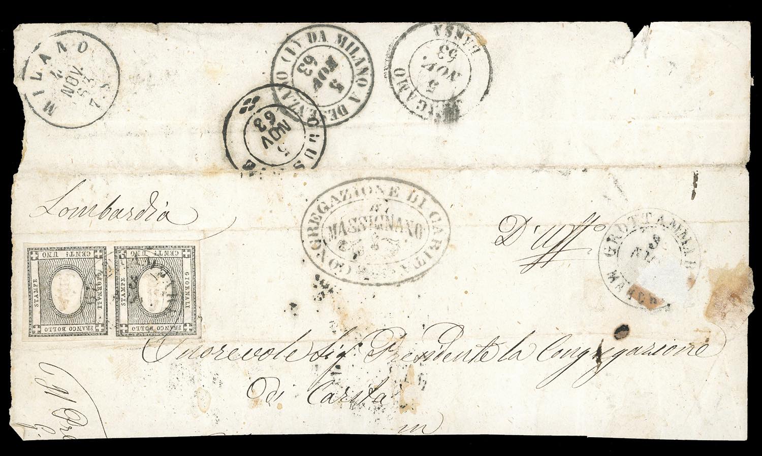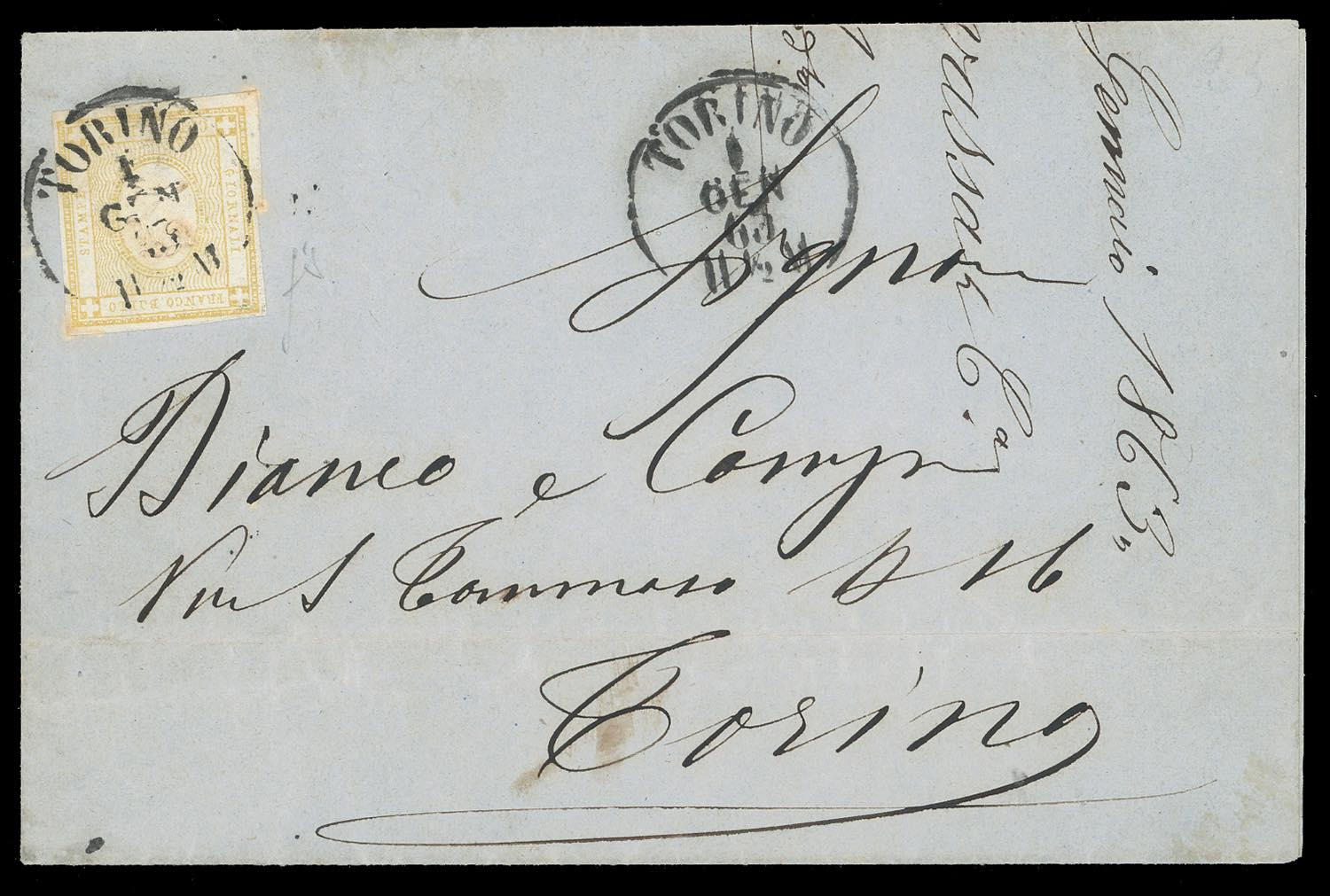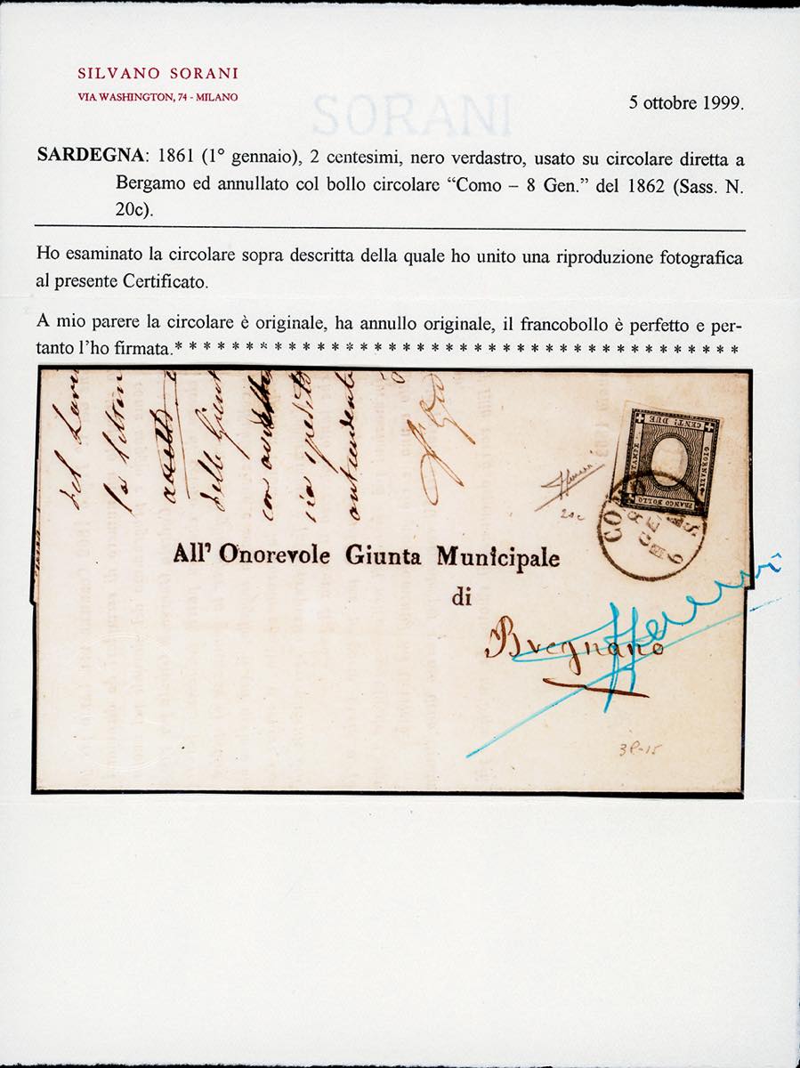SARDEGNA/REGNO D'ITALIA 1862/1863 - Quattro lettere e un frontespizio affrancati con i centesimi per stampati. Notata una buona varietà di tinte e un'interessante varietà. Per specialista. Un certificato Sorani.