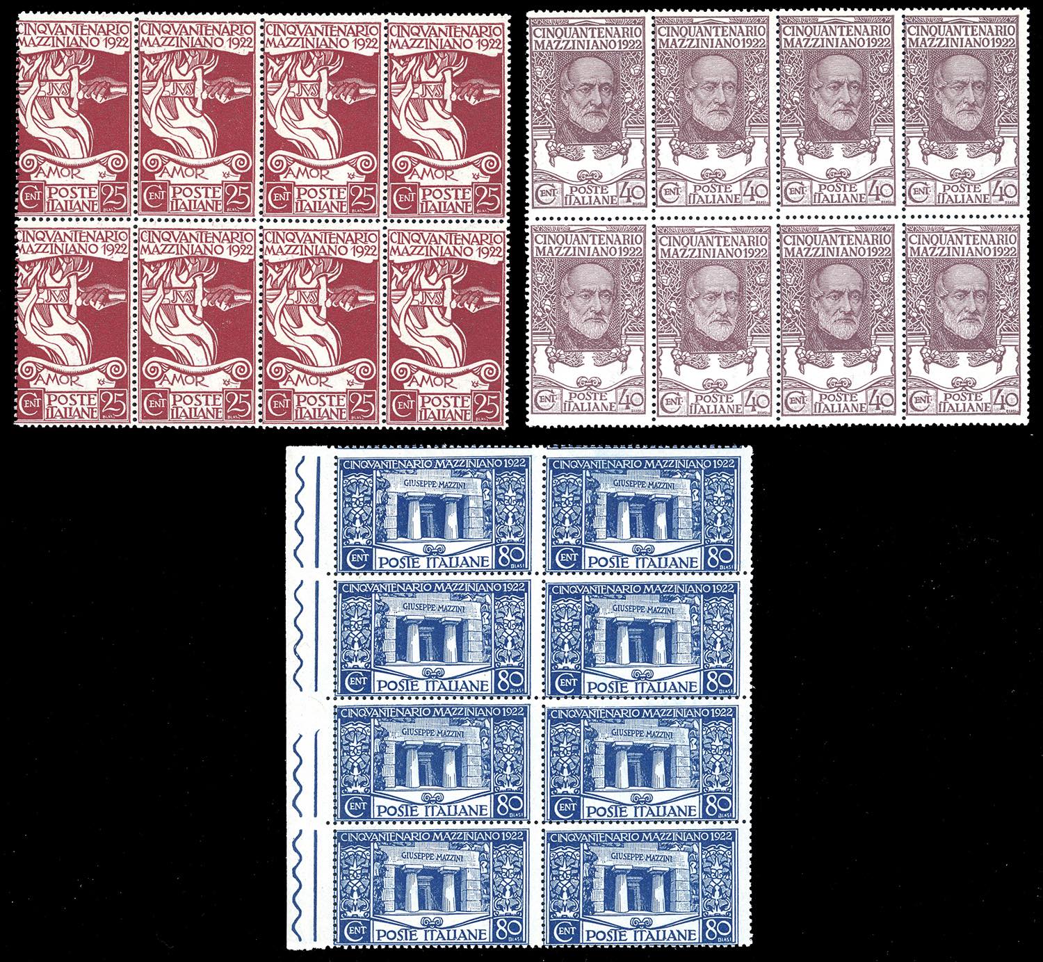 REGNO D'ITALIA 1922 - Mazzini, serie completa (128/130), blocchi di otto esemplari, gomma originale integra, perfetti.