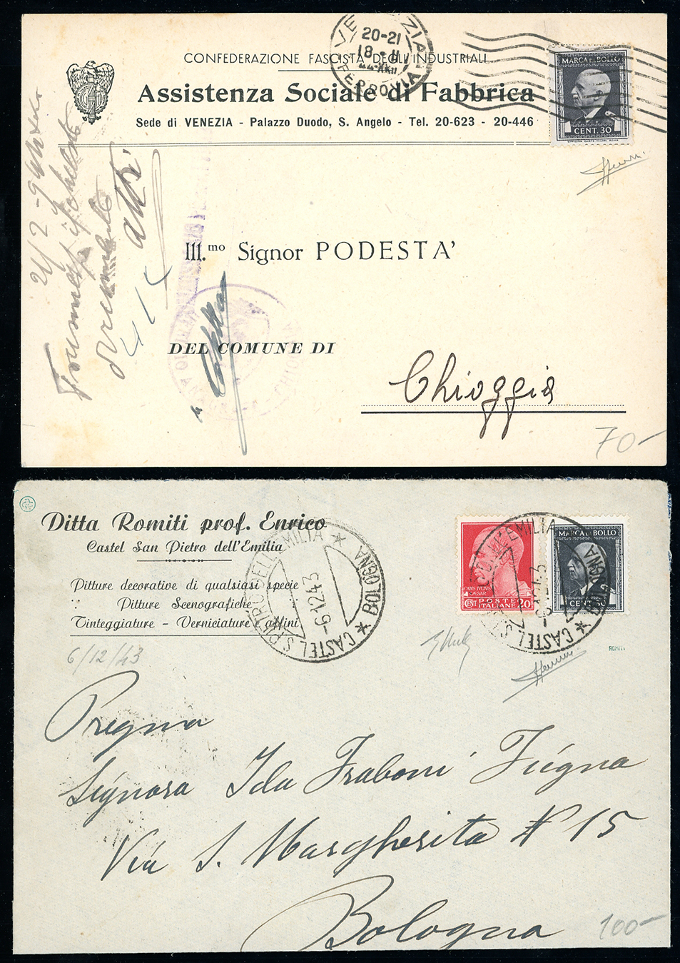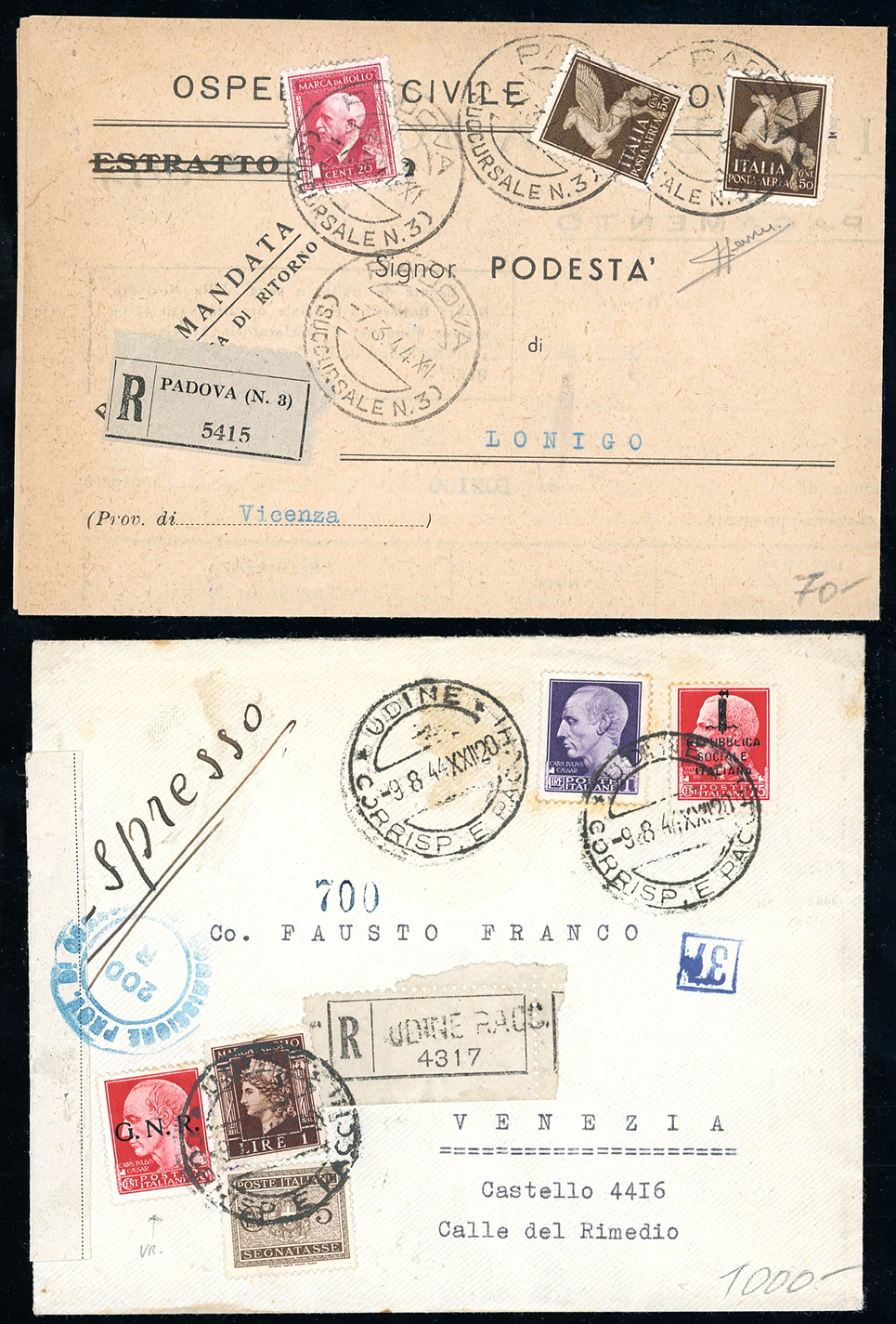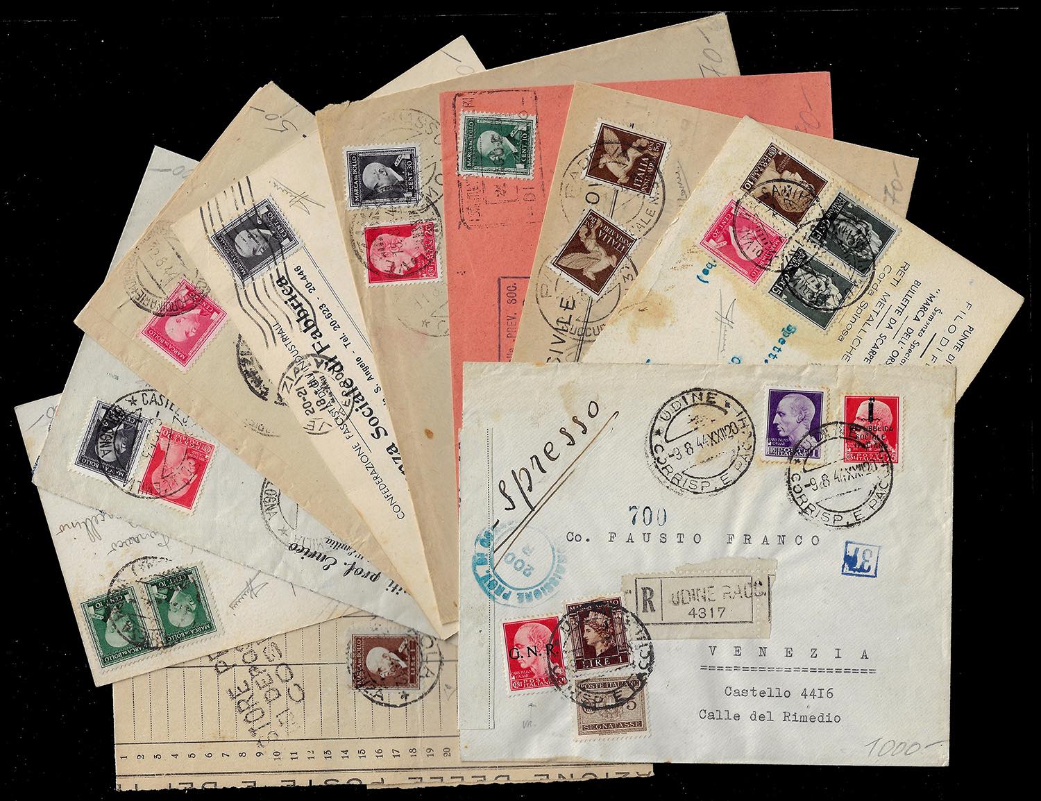 REPUBBLICA SOCIALE ITALIANA 1943/1944 - Interessante insieme di 10 lettere tutte con affrancature d'emergenza comprendenti marche da bollo utilizzate come francobolli. Notate diverse pregevoli presenze, numerose buste firmate Sorani. Ottimo anche per dettaglio. Insieme non comune.