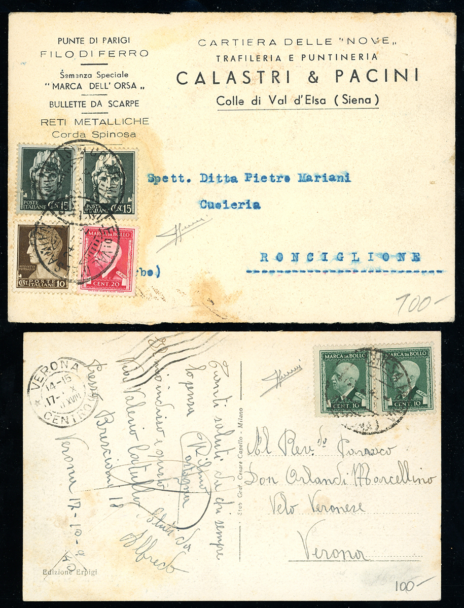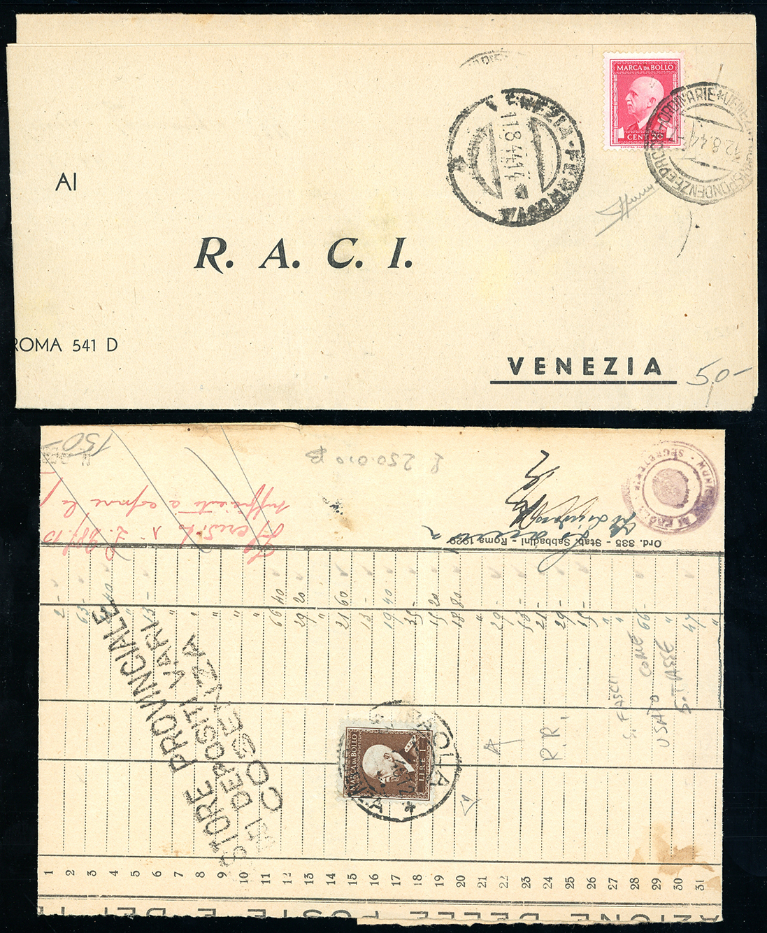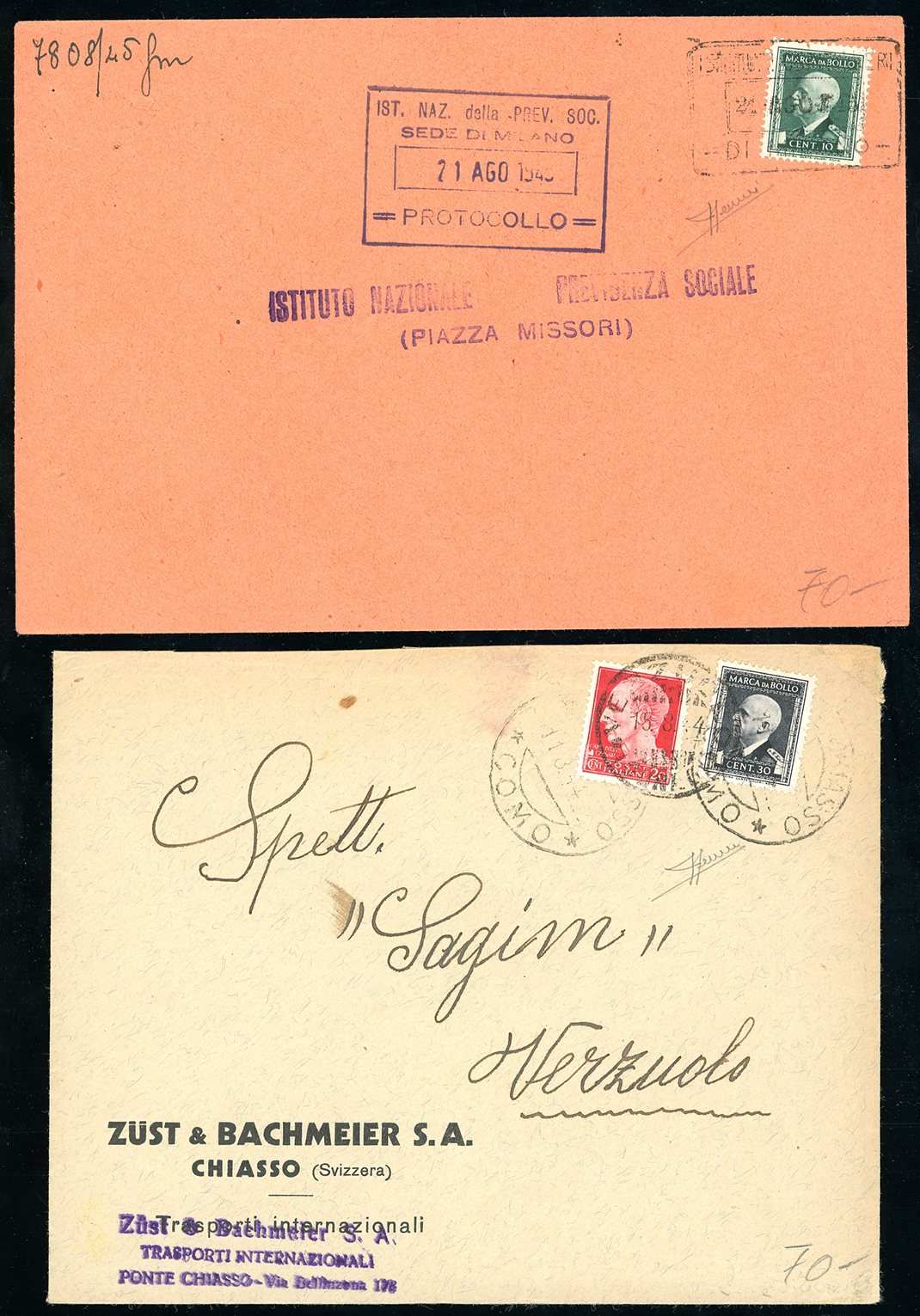 REPUBBLICA SOCIALE ITALIANA 1943/1944 - Interessante insieme di 10 lettere tutte con affrancature d'emergenza comprendenti marche da bollo utilizzate come francobolli. Notate diverse pregevoli presenze, numerose buste firmate Sorani. Ottimo anche per dettaglio. Insieme non comune.