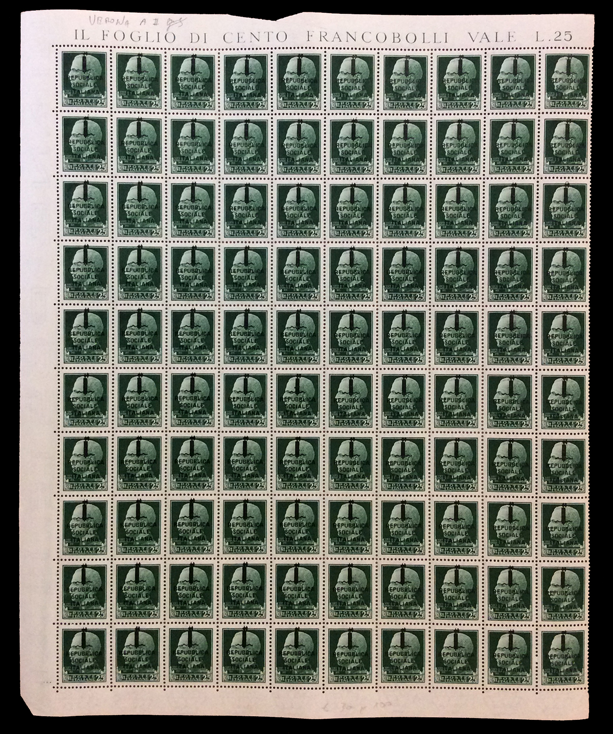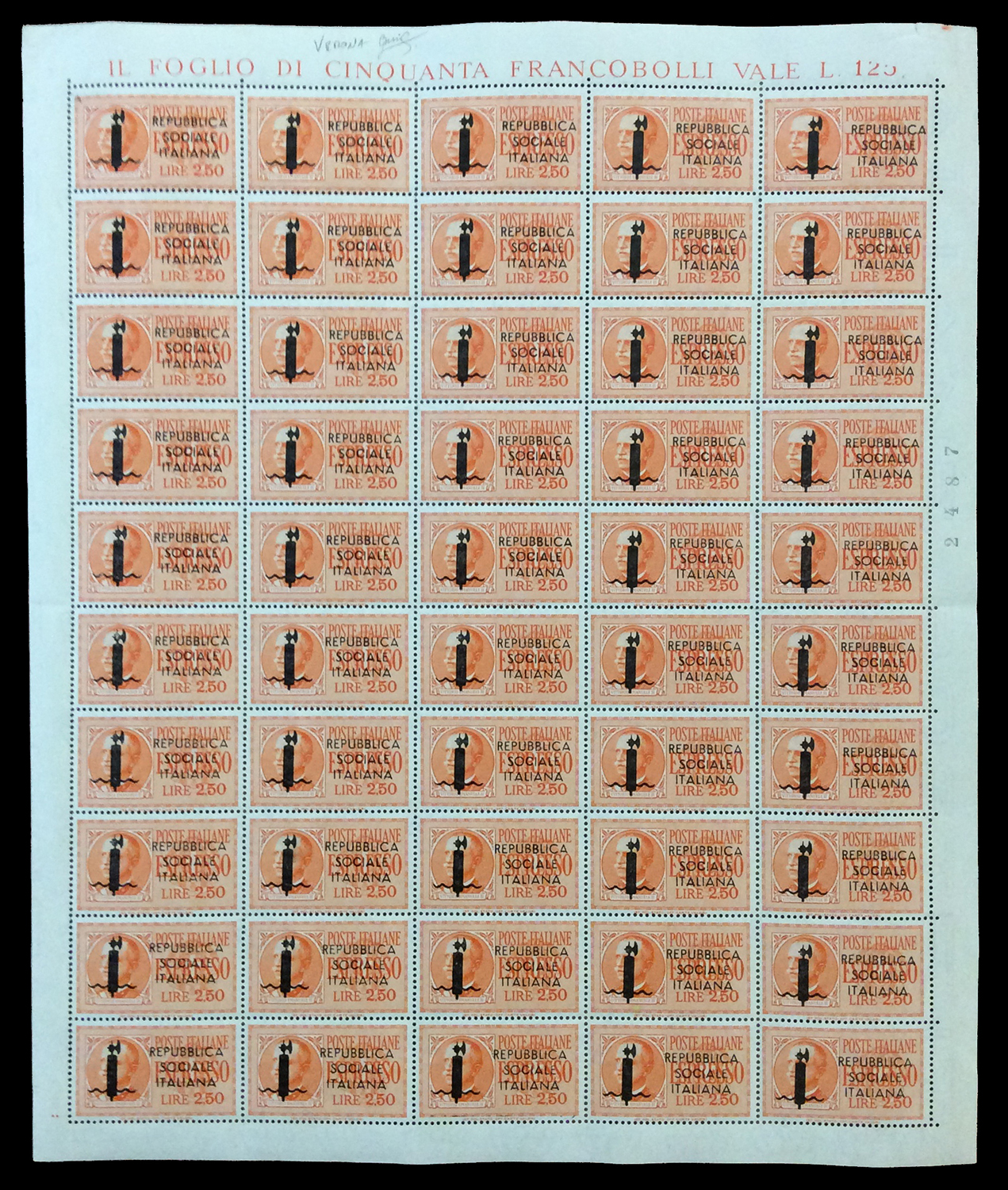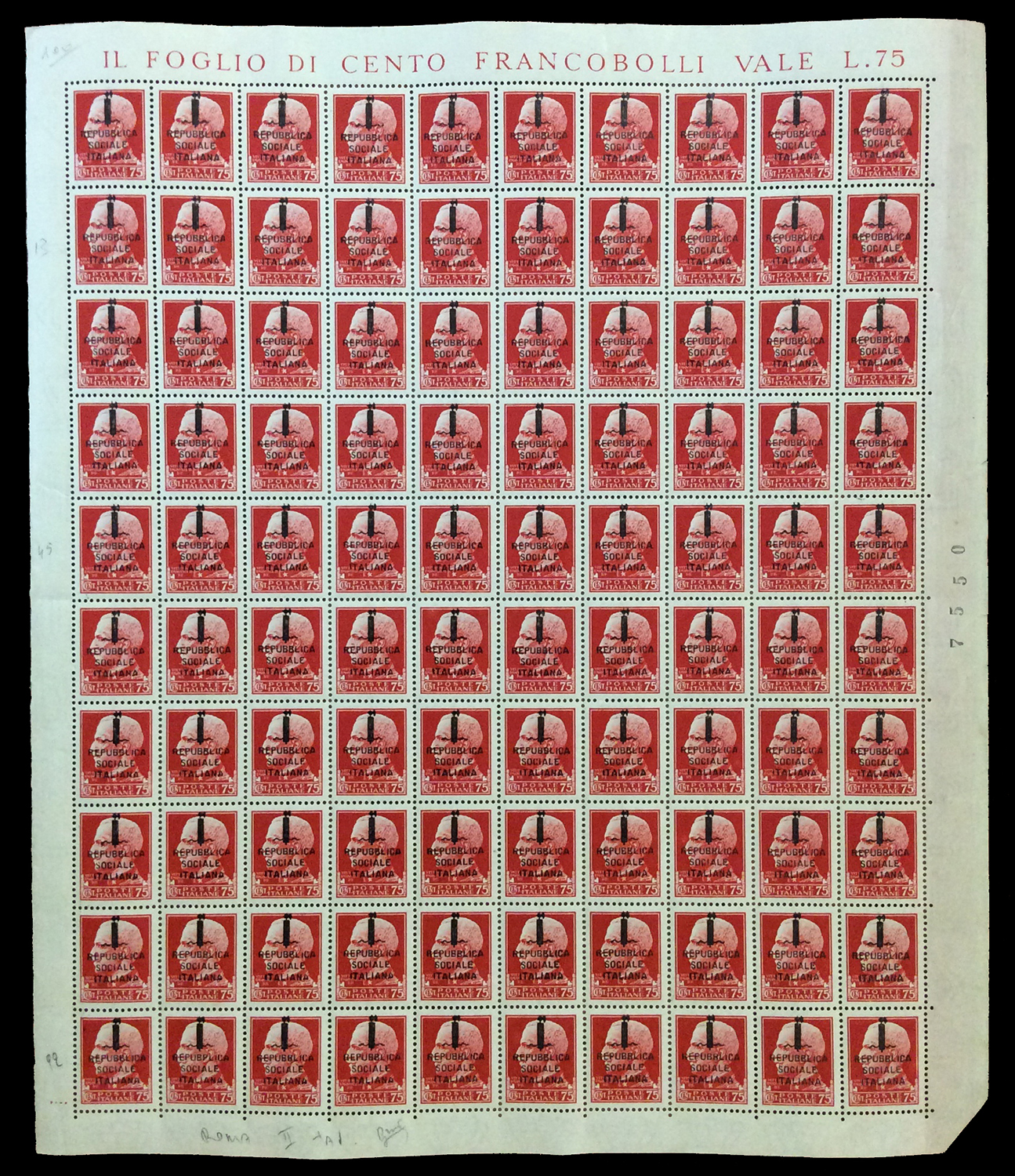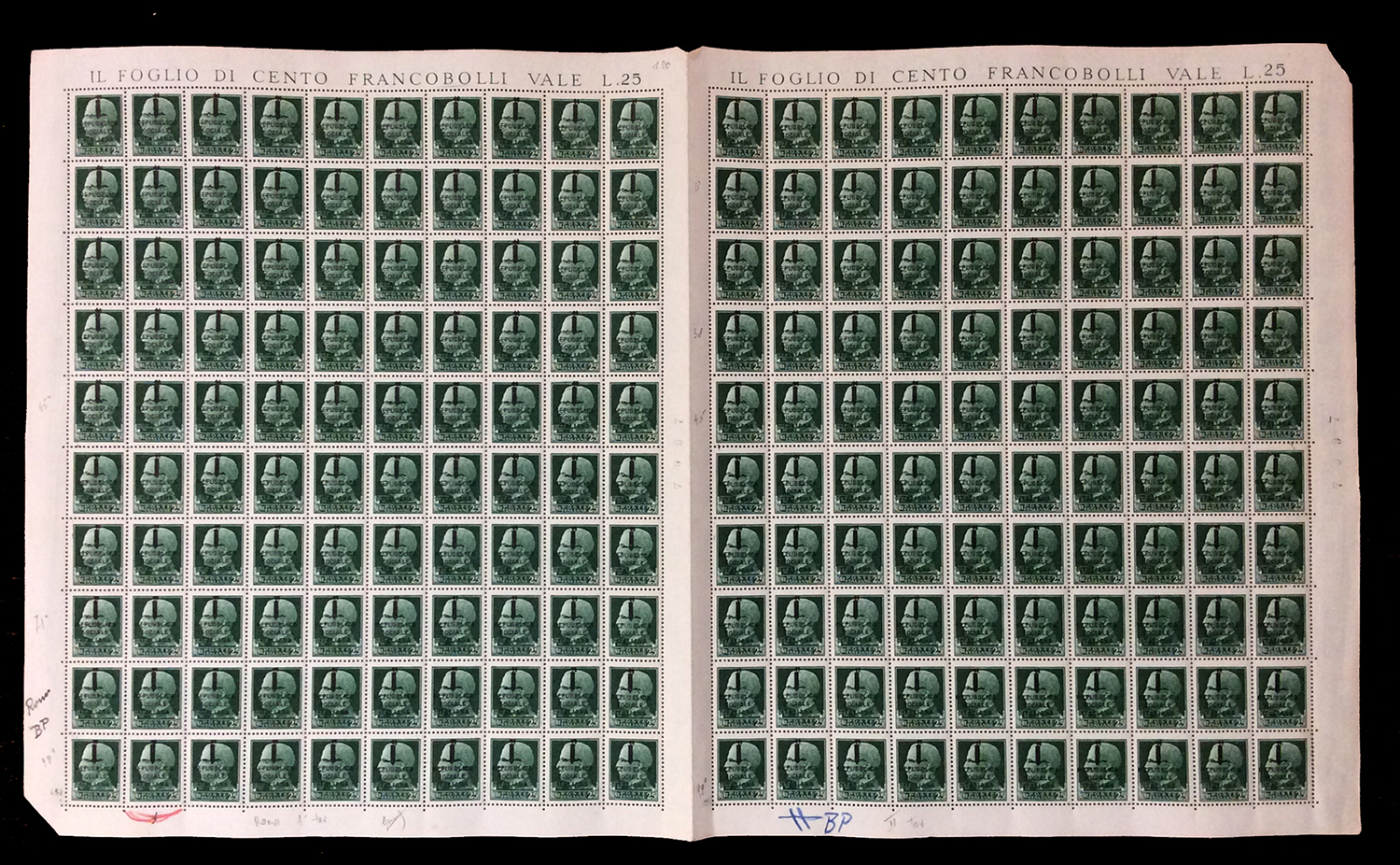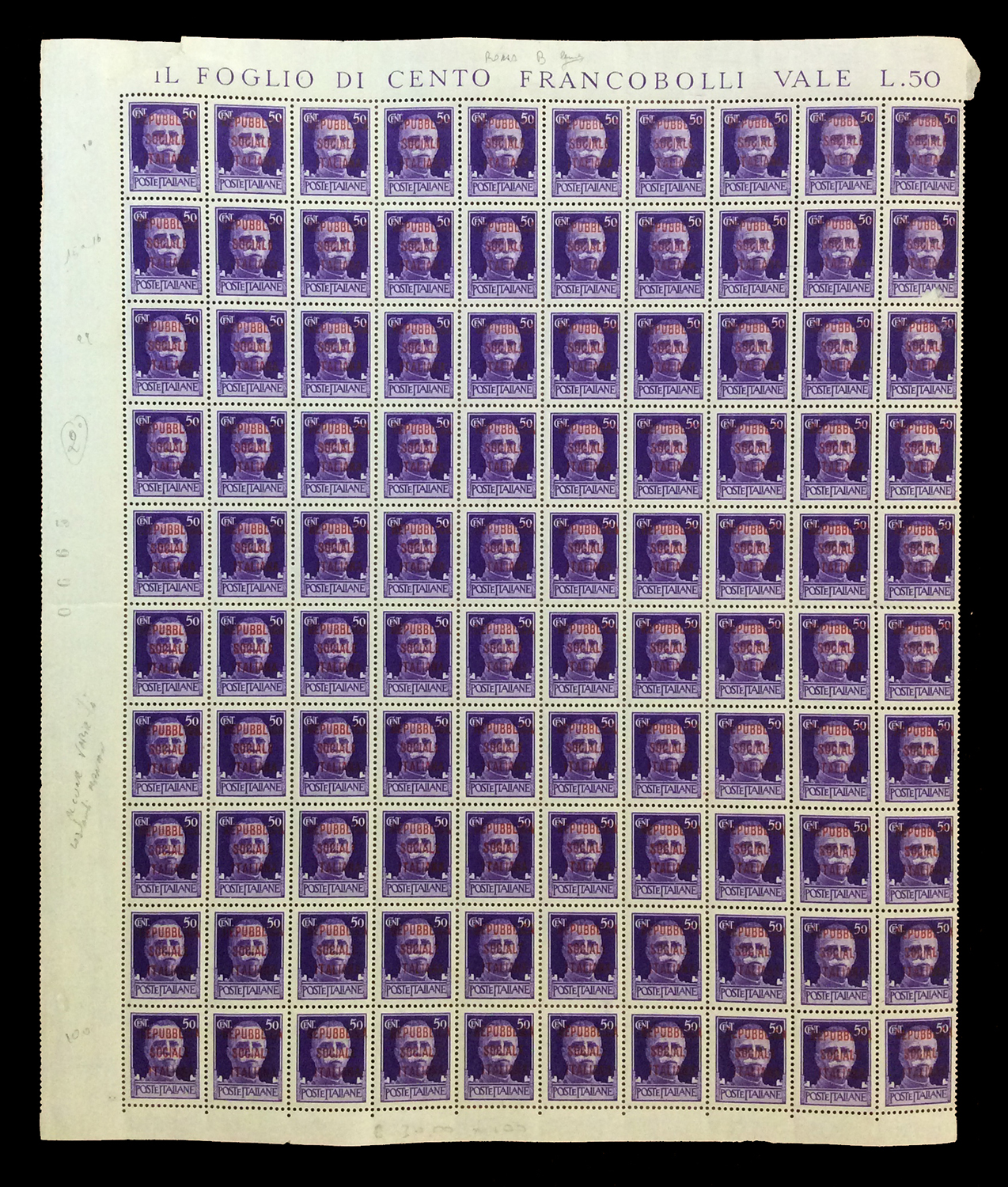 REPUBBLICA SOCIALE ITALIANA 1944 - Soprastampati fascetto o RSI, tredici fogli da 100 esemplari ed uno doppio con interspazi di gruppo, con soprastampe di varie tirature. Di sicuro interesse.
