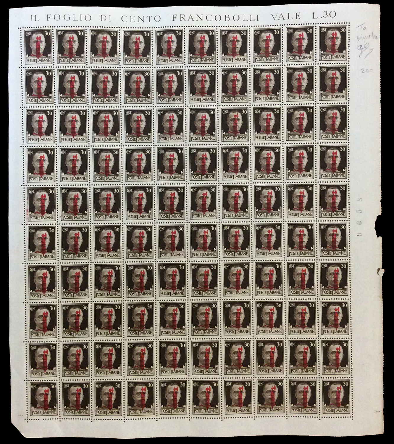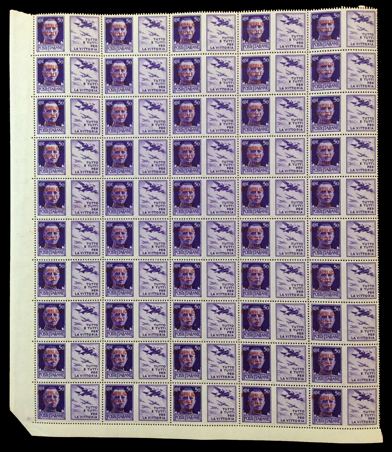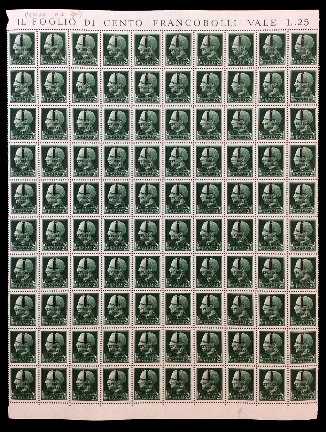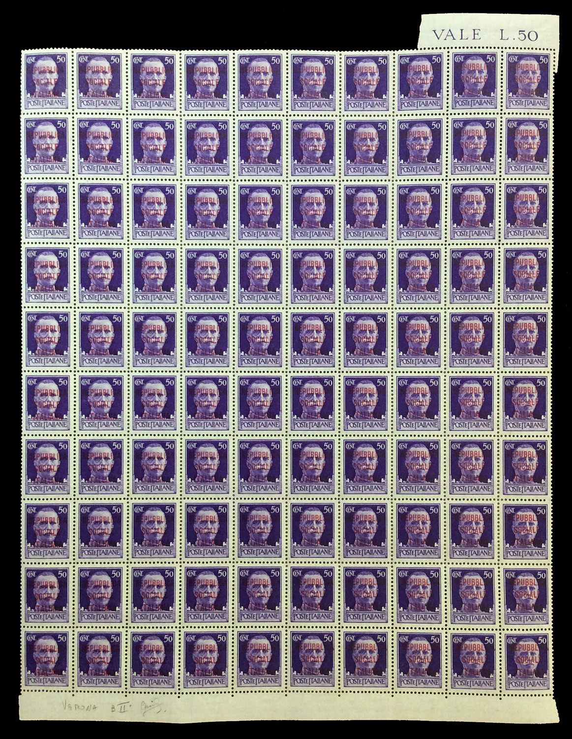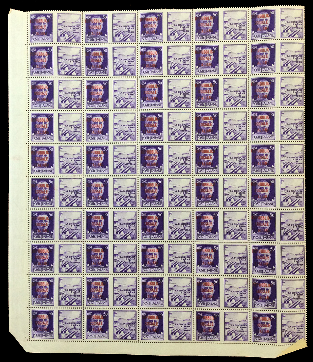 REPUBBLICA SOCIALE ITALIANA 1944 - Soprastampati fascetto o RSI, tredici fogli da 100 esemplari ed uno doppio con interspazi di gruppo, con soprastampe di varie tirature. Di sicuro interesse.