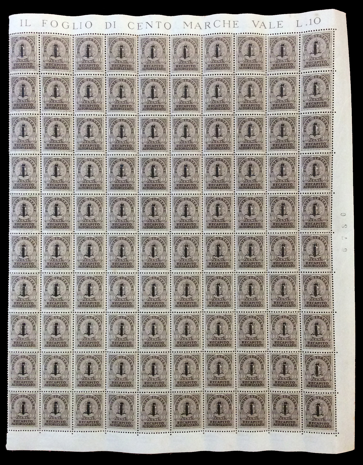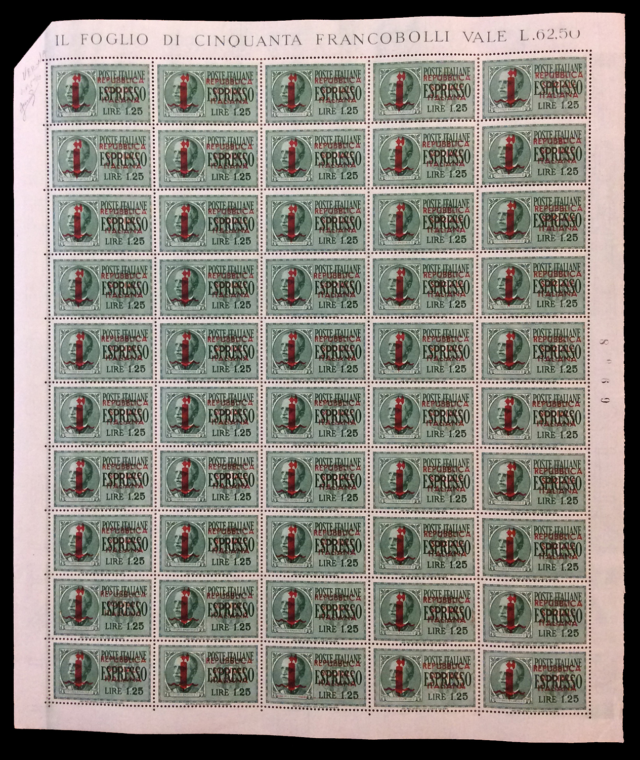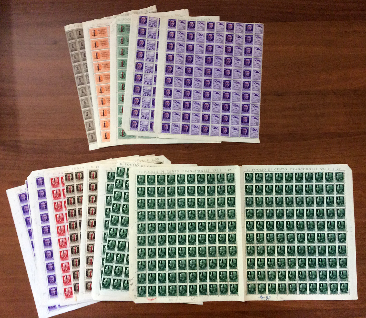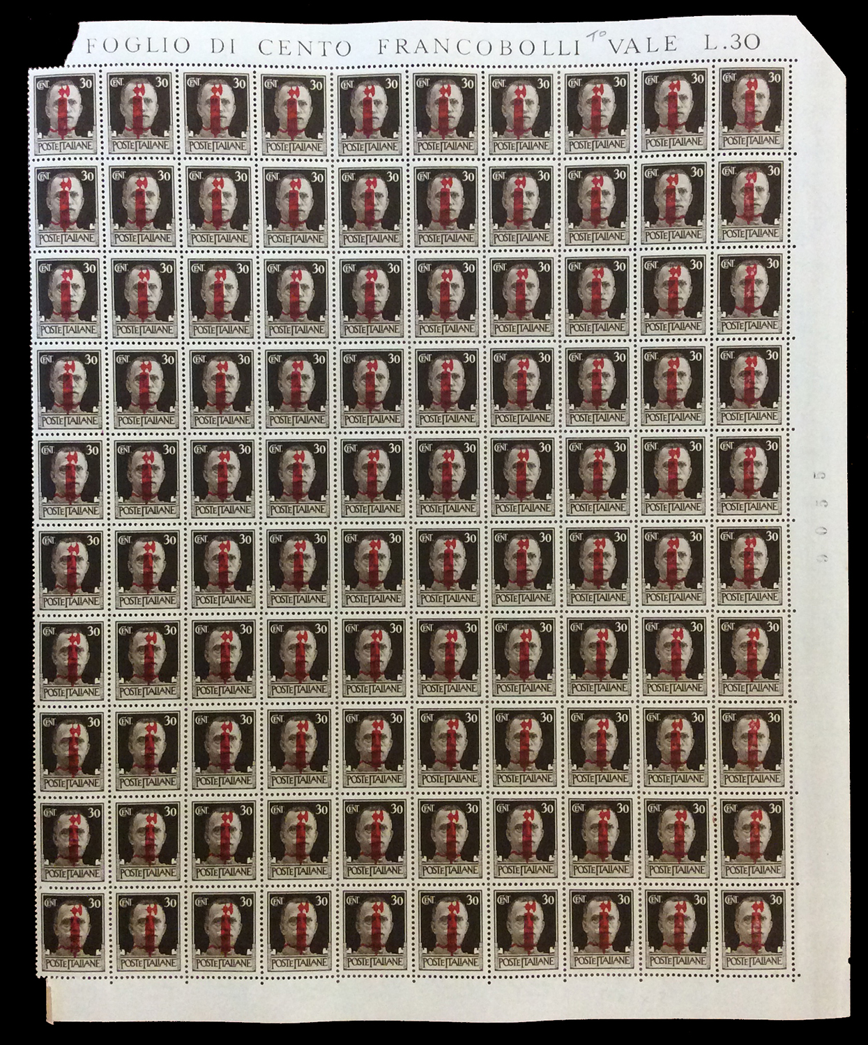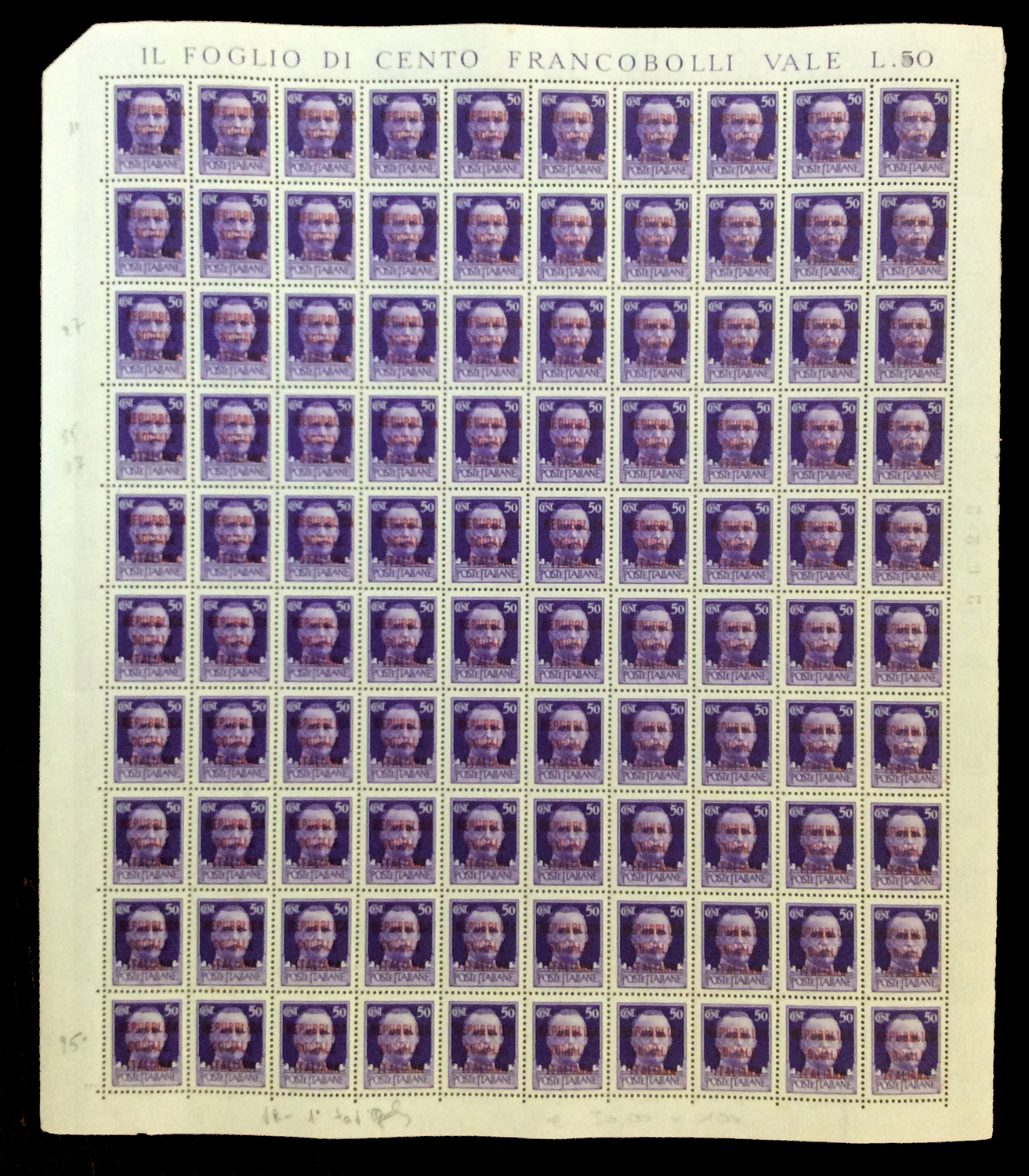 REPUBBLICA SOCIALE ITALIANA 1944 - Soprastampati fascetto o RSI, tredici fogli da 100 esemplari ed uno doppio con interspazi di gruppo, con soprastampe di varie tirature. Di sicuro interesse.