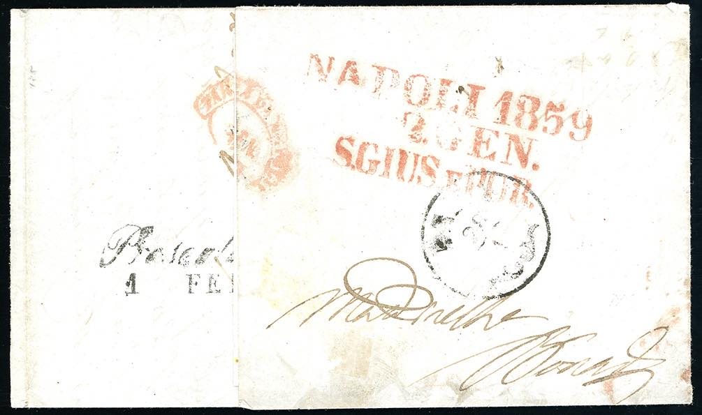 1859 - 5 grana I tavola (8), perfetto, isolato su fresca lettera da Napoli 22 gennaio 1859 a Odolo, in Lombardo Veneto, dove fu tassata 8 carantani, da qui venne rispedita a Preseglie, riannullando il francobollo con il bollo di Iseo 30/1. Insieme molto raro. Raybaudi, cert. Ferrario. Ex coll. Imperato.