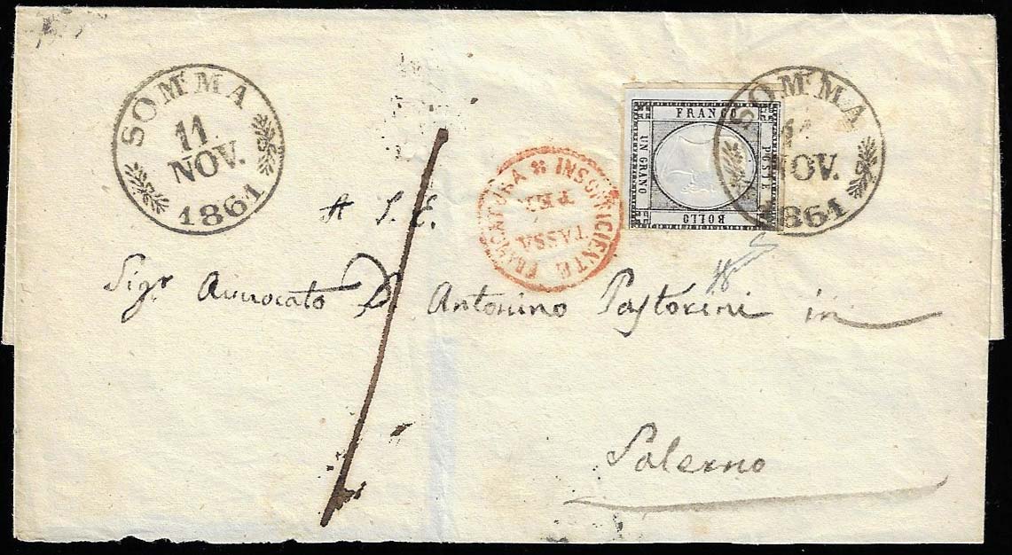 SOMMA, cerchio punti 13 - 1 grano (19), intaccato a destra, su sovracoperta di lettera del 11711/1861 per Salerno, insufficientemente affrancata e tassata 1. Annullo molto nitido. Ferrario.