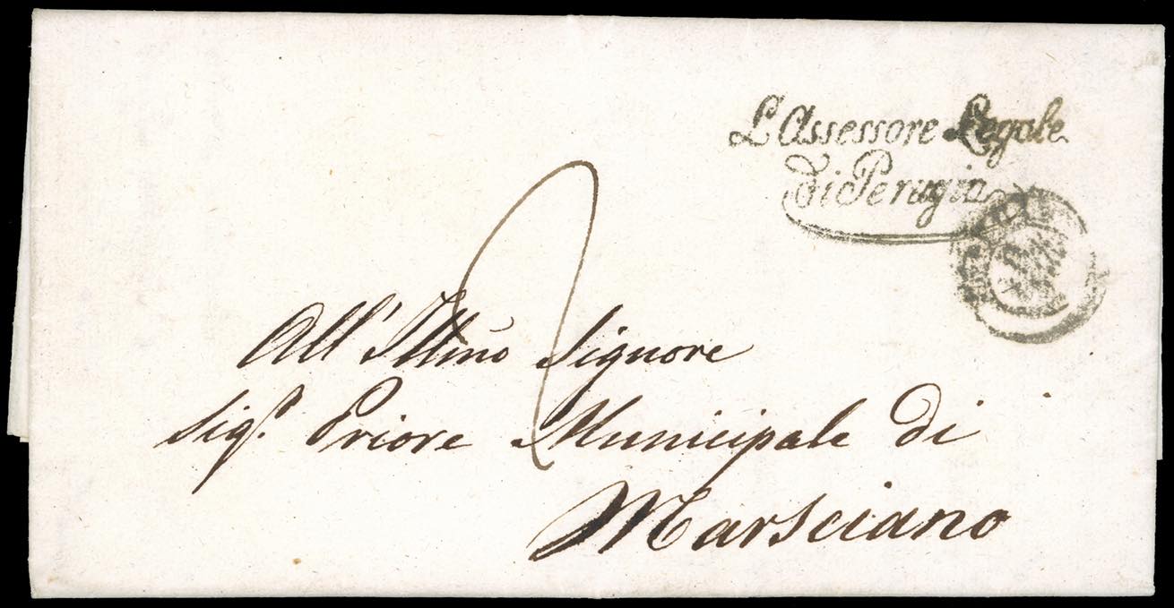 1858 - 1/2 baj grigio verdastro (1b), blocco di quattro esemplari, uno con un margine leggermente intaccato, al verso di fresca lettera in porto assegnato da Perugia 8/4/1858 a Marsciano, tassata 2 baj sul fronte. Molto rari i blocchi di questa pregevole tinta sottoquotata, specie se utilizzati come segnatasse (affrancatura non censita al verso). Ottimo aspetto. A ed E.Diena.