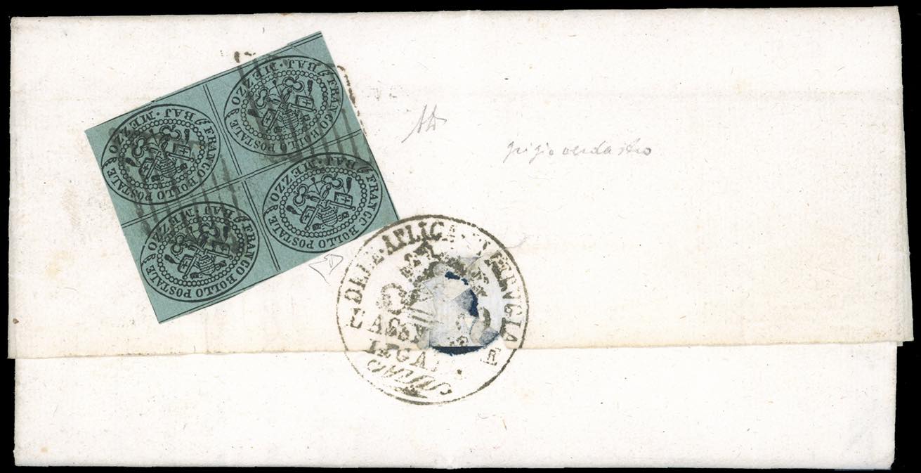 1858 - 1/2 baj grigio verdastro (1b), blocco di quattro esemplari, uno con un margine leggermente intaccato, al verso di fresca lettera in ... Read more