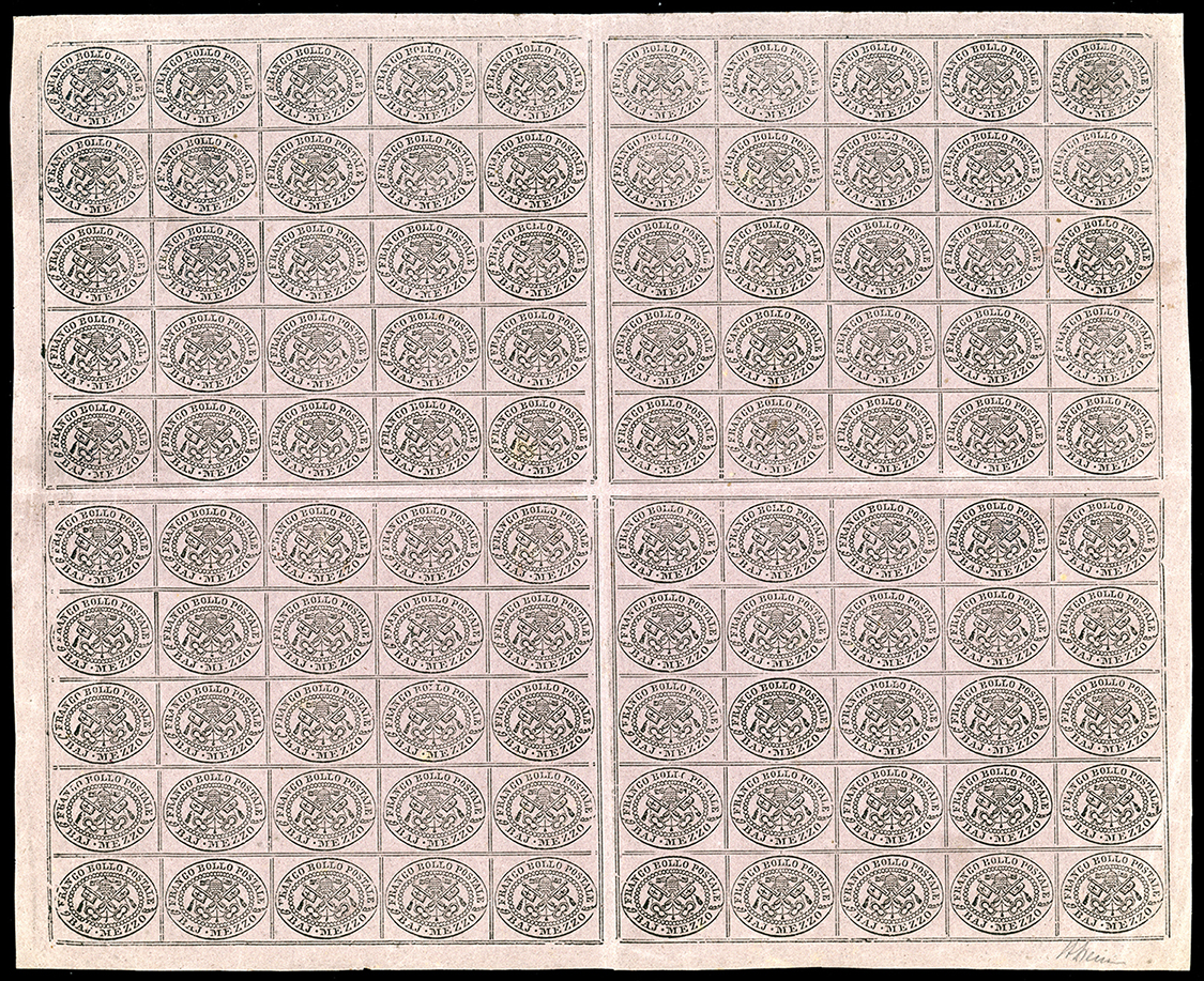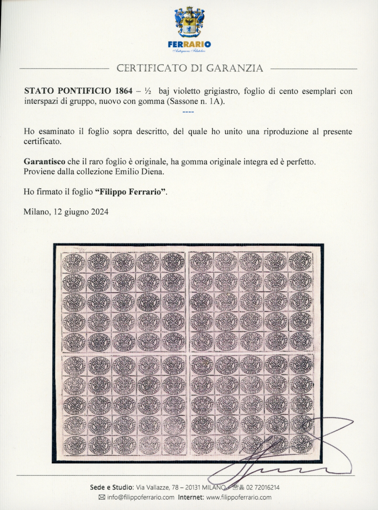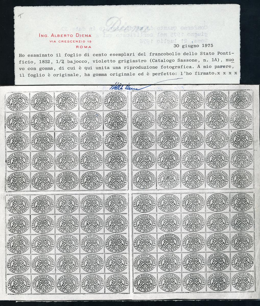 1864 - 1/2 baj violetto grigiastro (1A), foglio nuovo di cento esemplari con interspazi di gruppo, gomma originale integra, perfetto. Molto bello ed estremamete raro. Cert. Alberto Diena e Ferrario. Ex coll. Emilio Diena.