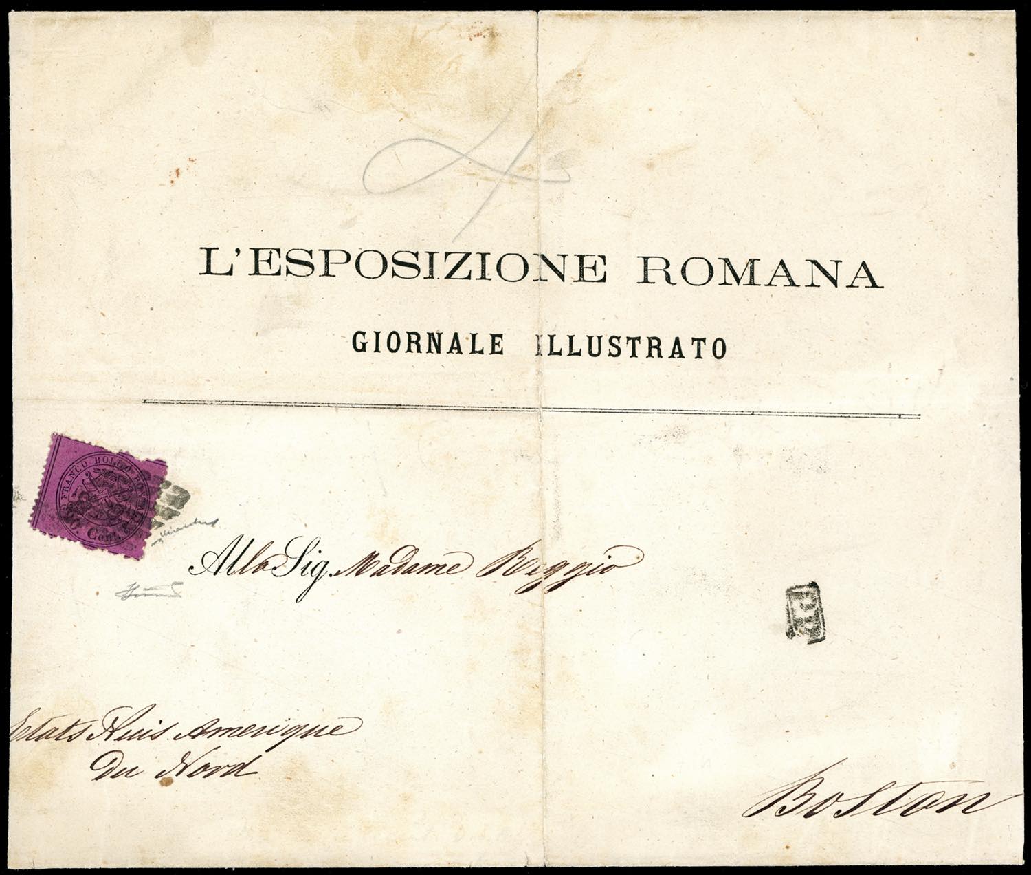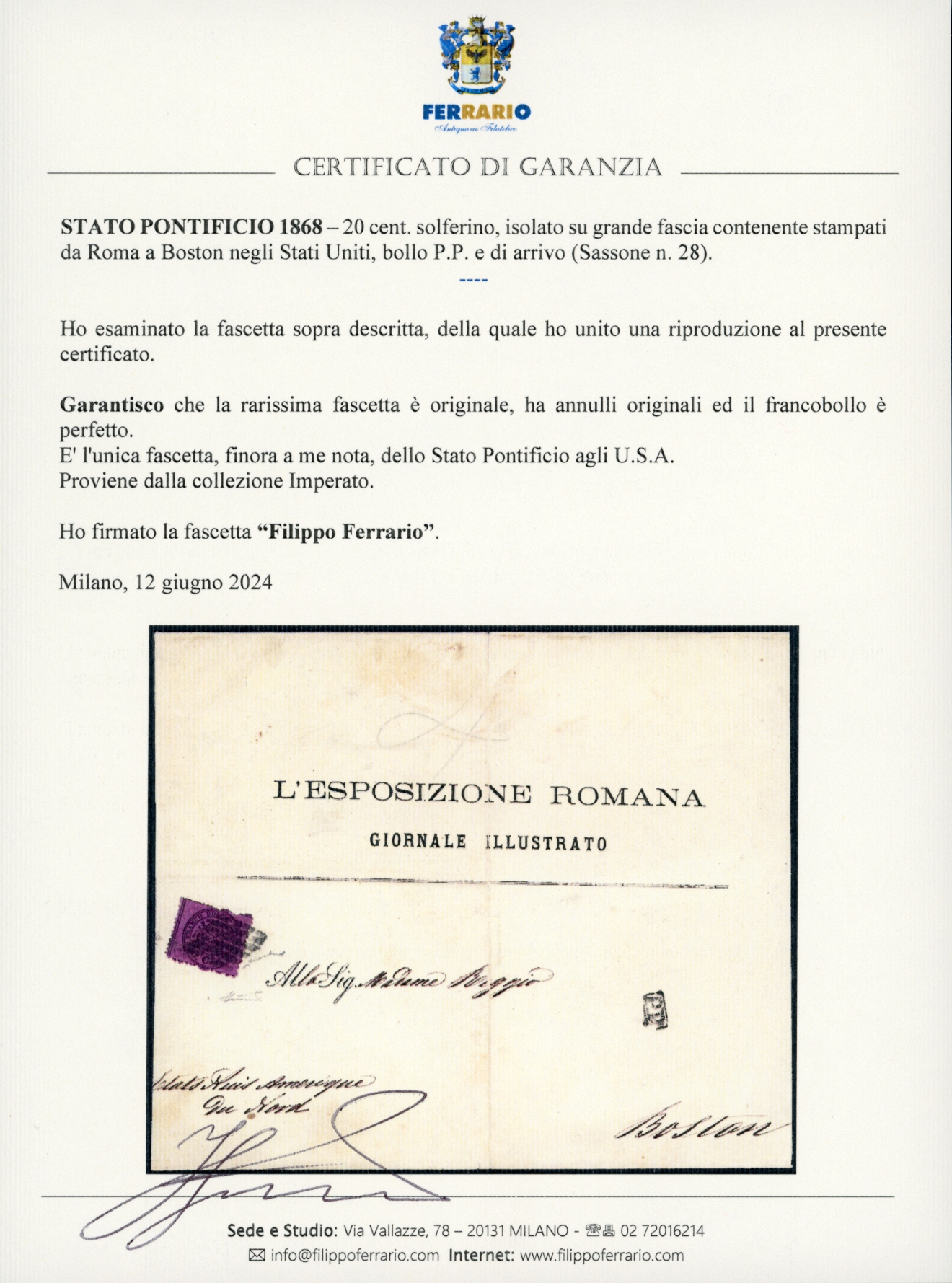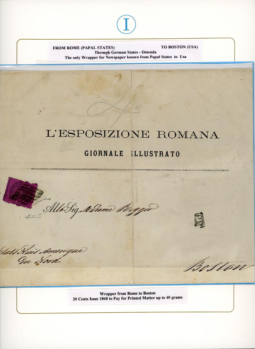 1868 - 20 cent. solferino (28), isolato su grande fascia contenente stampati da Roma a Boston negli Stati Uniti, bollo P.P. e di arrivo. E' l'unica fascetta finora nota dal Pontificio agli U.S.A. Grande rarità per collezione specializzata. Cert. Ferrario. Ex coll. Imperato.