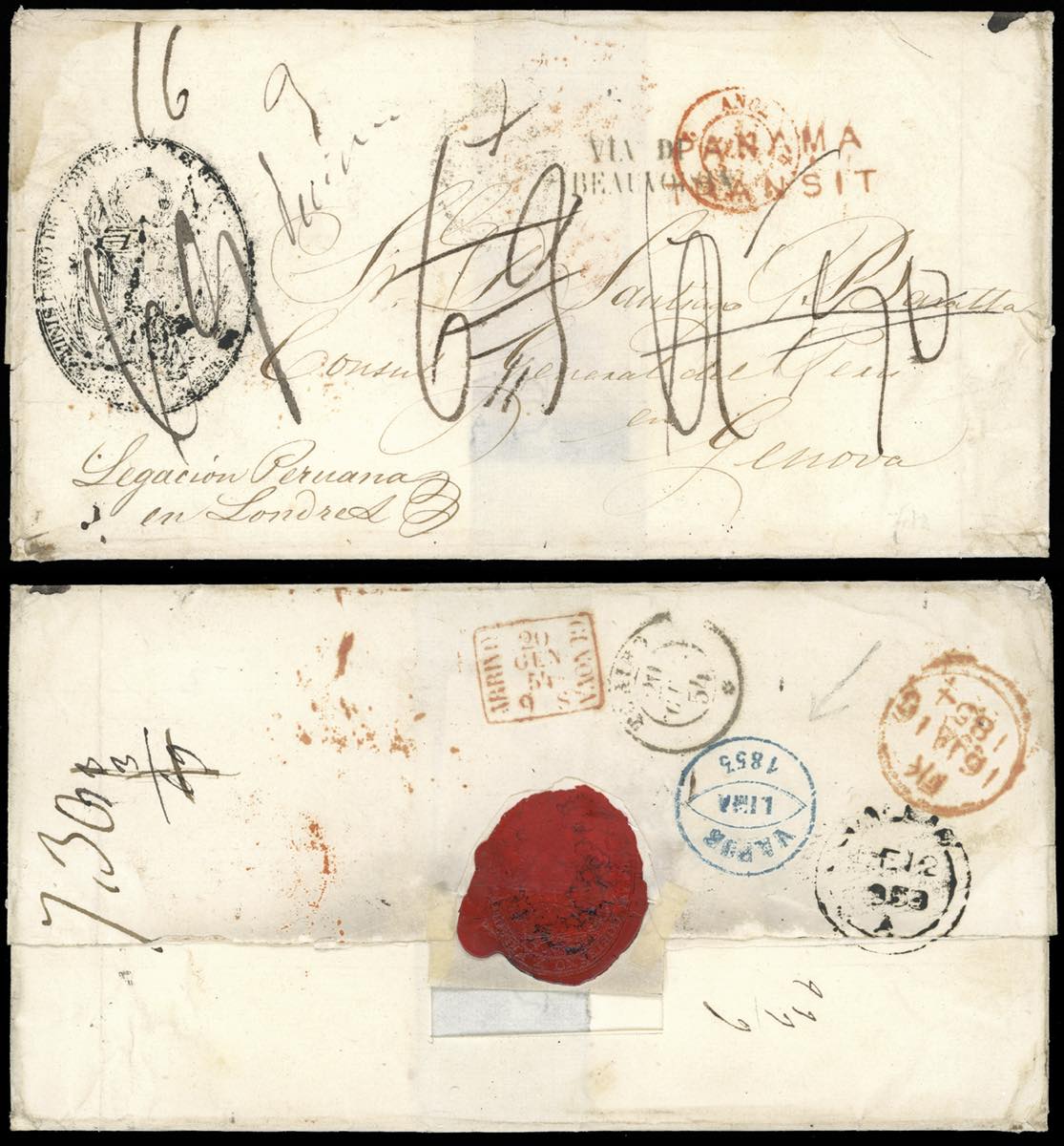 INCOMING MAIL PERU' 1853 - Lettera non affrancata da Lima, in Perù, a Genova 20/1/1854, trasportata con i vapori via Gran Bretagna e Francia. Sul fronte il lineare "PANAMA TRANSIT", avvenuto a dorso di mulo e numerosi segni di tassa cassati e corretti più volte. Rara e di grande fascino.