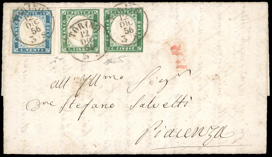 1856 - 5 cent. verde smeraldo giallastro, coppia orizzontale, 20 cent. cobalto (13e,15), perfetti, su fresca lettera da Torino 12/12/1856 a Piacenza, nel Ducato di Parma. Bella e non comune. Chiavarello, Ferrario. Ex coll. Imperato.