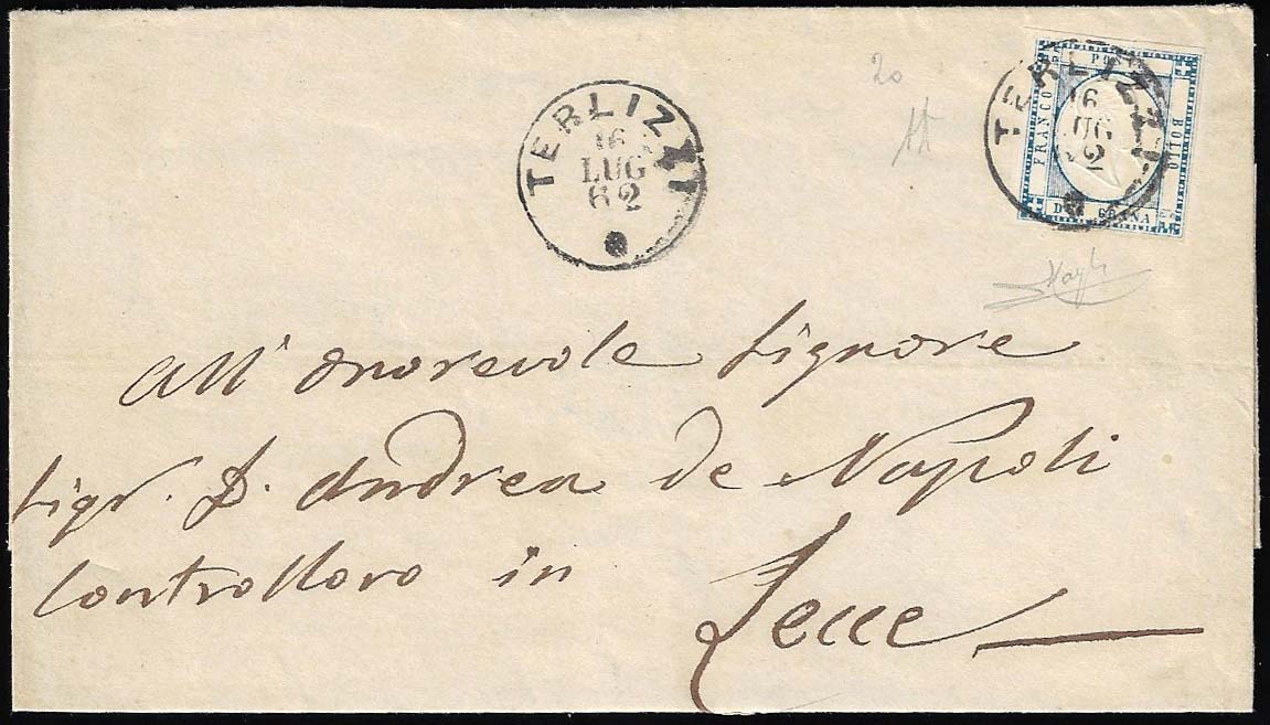 TERLIZZI, cerchio piccolo punti 6 - 2 grana (20), perfetto, su sovracoperta di lettera del 16/7/1862 per Lecce. Bella! A.Diena, Raybaudi.