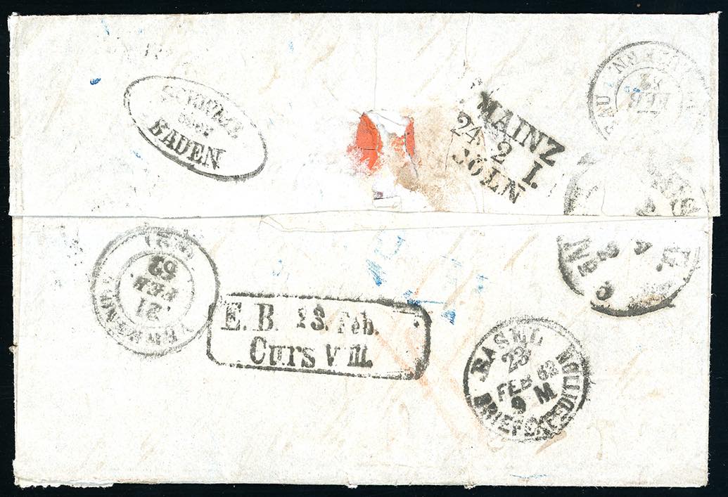 1862 - 20 cent. azzurro (15Dc), coppia orizzontale, piega verticale sul secondo esemplare, ben marginata, su lettera "Ambulante Genova-Torino (2)-21 feb 1862", bollo lineare di stazione Genova, diretta a Solingen in Prussia, via di Svizzera, bollo "francobollo insufficiente" e varie tassazioni. Insieme raro. Ferrario.