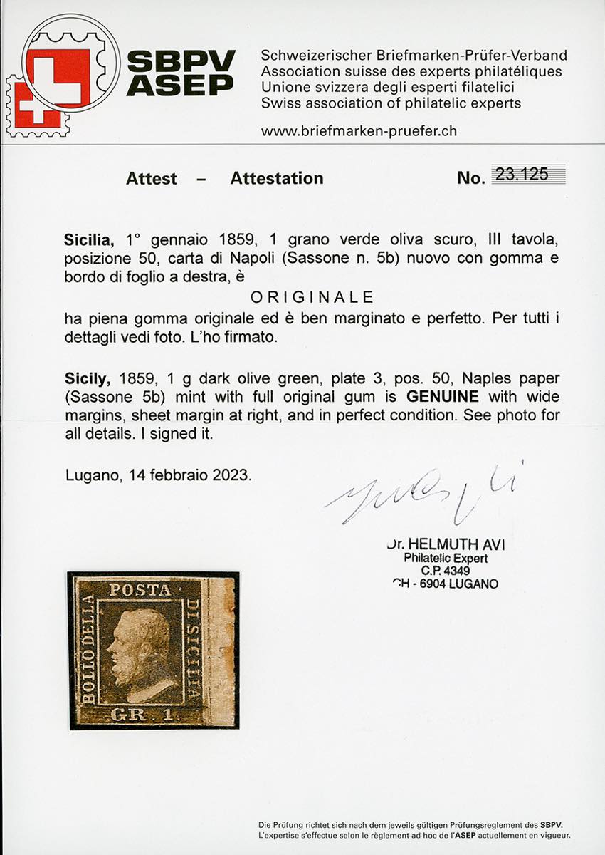 1859 - 1 grano verde oliva scuro, III tavola, carta di Napoli, posiz. 50 (5b), bordo di foglio, gomma originale, perfetto. Pregevole tinta, ... Read more