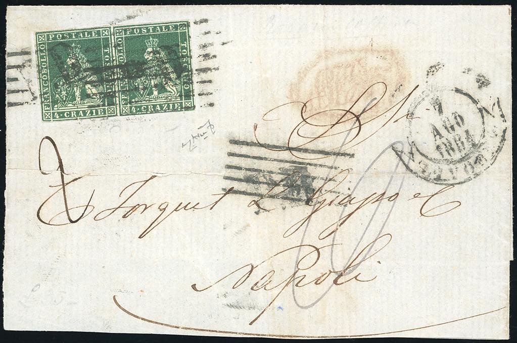 1854 - 4 crazie verde su grigio (6), coppia, ottimo stato, su sovracoperta di lettera da Livorno 7/8/1854, via di terra, bollo di transito per lo Stato Pontificio al verso, tassata 10 grana. Sul fronte il bollo P.D. di Livorno è stato cassato con il muto a cinque sbarre. Interessante. Dettagliato cert. Avanzo.
