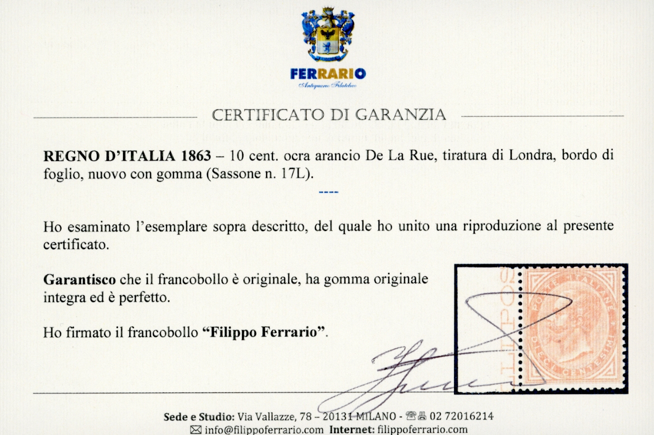 1863 - 10 cent. ocra arancio, De La Rue, tiratura di Londra (L17), bordo di foglio, gomma originale integra, perfetto e molto fresco. G.Oliva, A.Diena, Zanaria, cert. E.Diena e Ferrario.