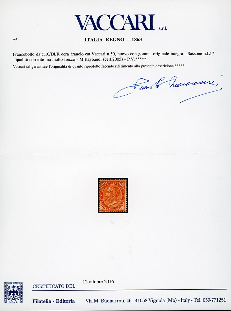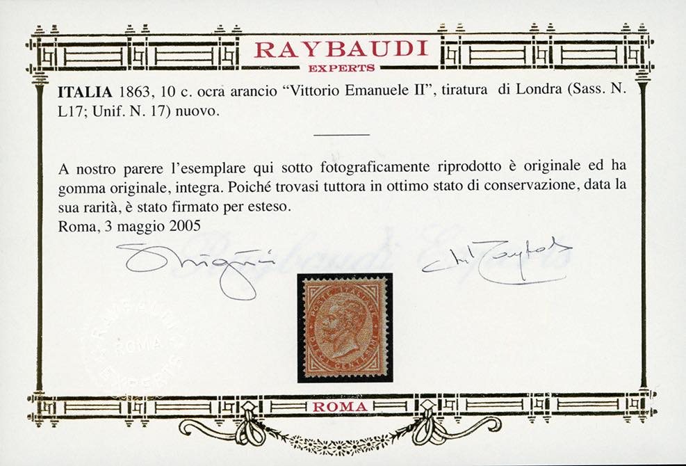 1863 - 10 cent. ocra arancio, De La Rue, tiratura di Londra (L17), nuovo, gomma originale integra, perfetto e molto fresco. Cert. Oro ... Read more