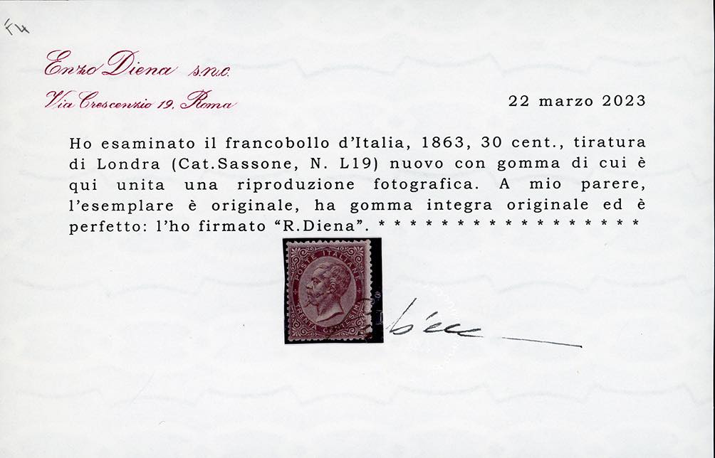 1863 - 30 cent. bruno castano, De La Rue, tiratura di Londra (L19), gomma originale integra, perfetto e molto fresco. Raro e di ottima ... Read more