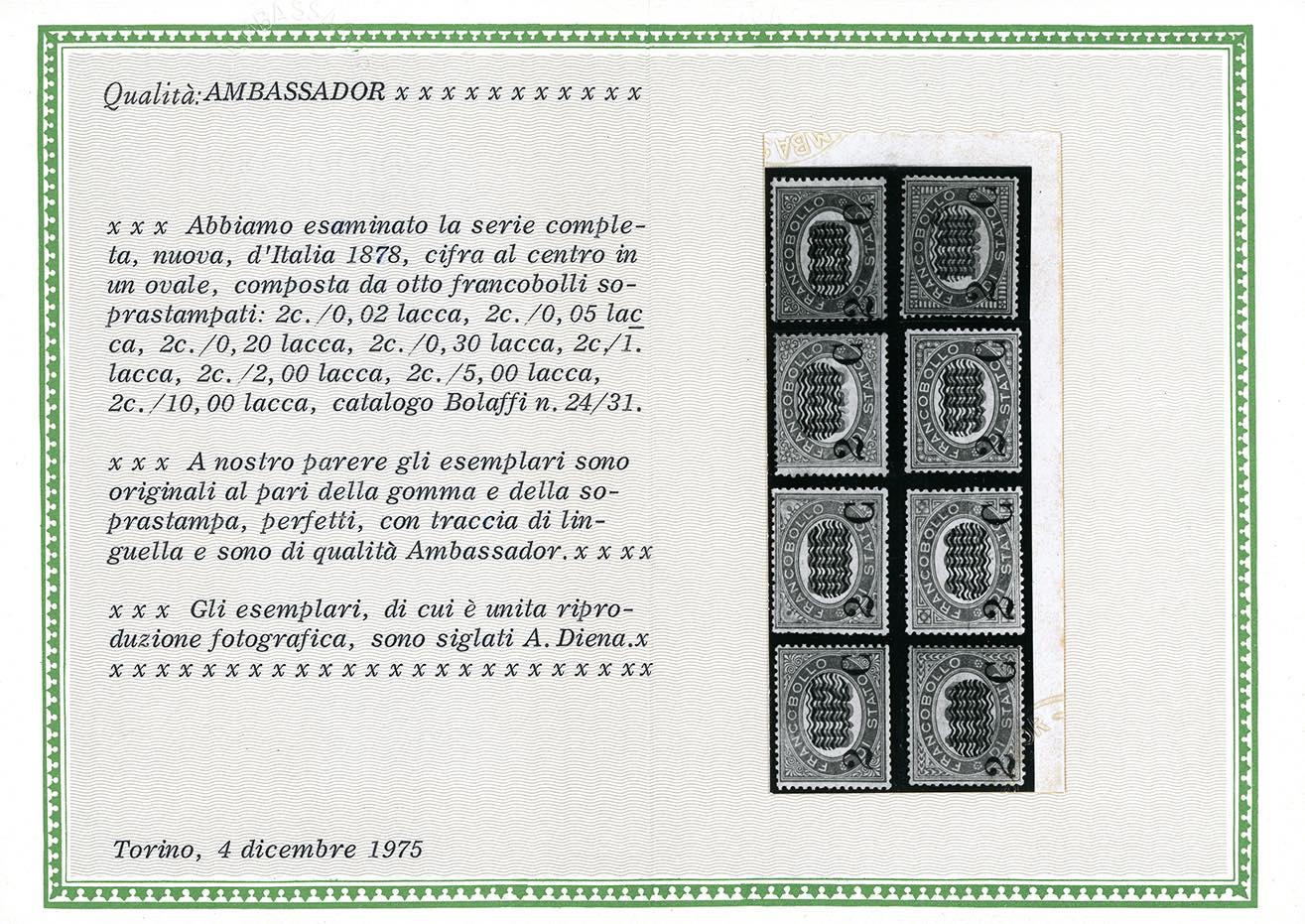 1878 - Servizio Soprastampati, serie completa (29/36), nuovi, gomma originale, perfetti. Molto freschi. Firmati da noti periti affidabili, cert. Bolaffi.
