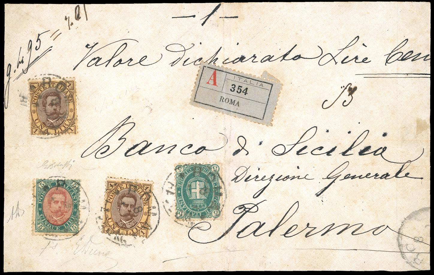 1889 - 5 lire verde e carminio, 5 cent., 1 lira, due esemplari, Umberto I (49,44,48), perfetti, su frontespizio di lettera assicurata con valore dichiarato da Roma a Palermo. Rarità del Regno d'Italia. G.Bolaffi, Em. ed A.Diena, Fiecchi.