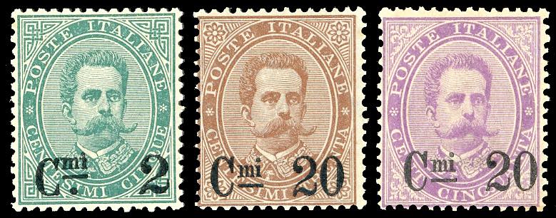 1890/91 - Soprastampati, serie completa (56/58), discreta centratura, gomma originale integra, perfetti. Raybaudi, cert. Sorani.