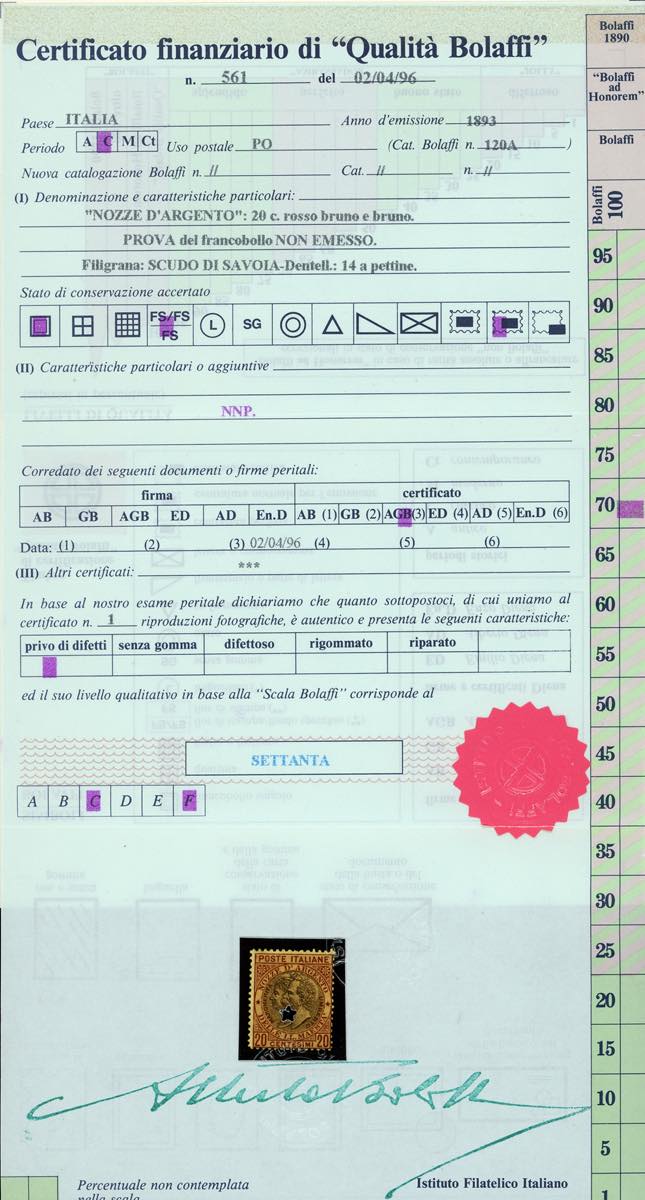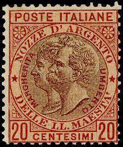 1893 - 20 cent. rosso bruno e bruno Nozze d'argento, non emesso (64A), gomma originale integra, perfetto e molto fresco. Raybaudi, cert. Finanziario Bolaffi 70% (cat.Sassone € 6.000/12.000).