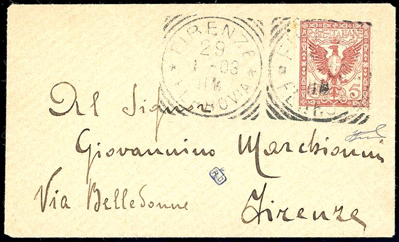 1903 - 5 cent. bruno lillaceo Floreale, colore diverso (70B), perfetto, isolato su bustina da Firenze 29/1/1903 per città. Raro uso ... Read more