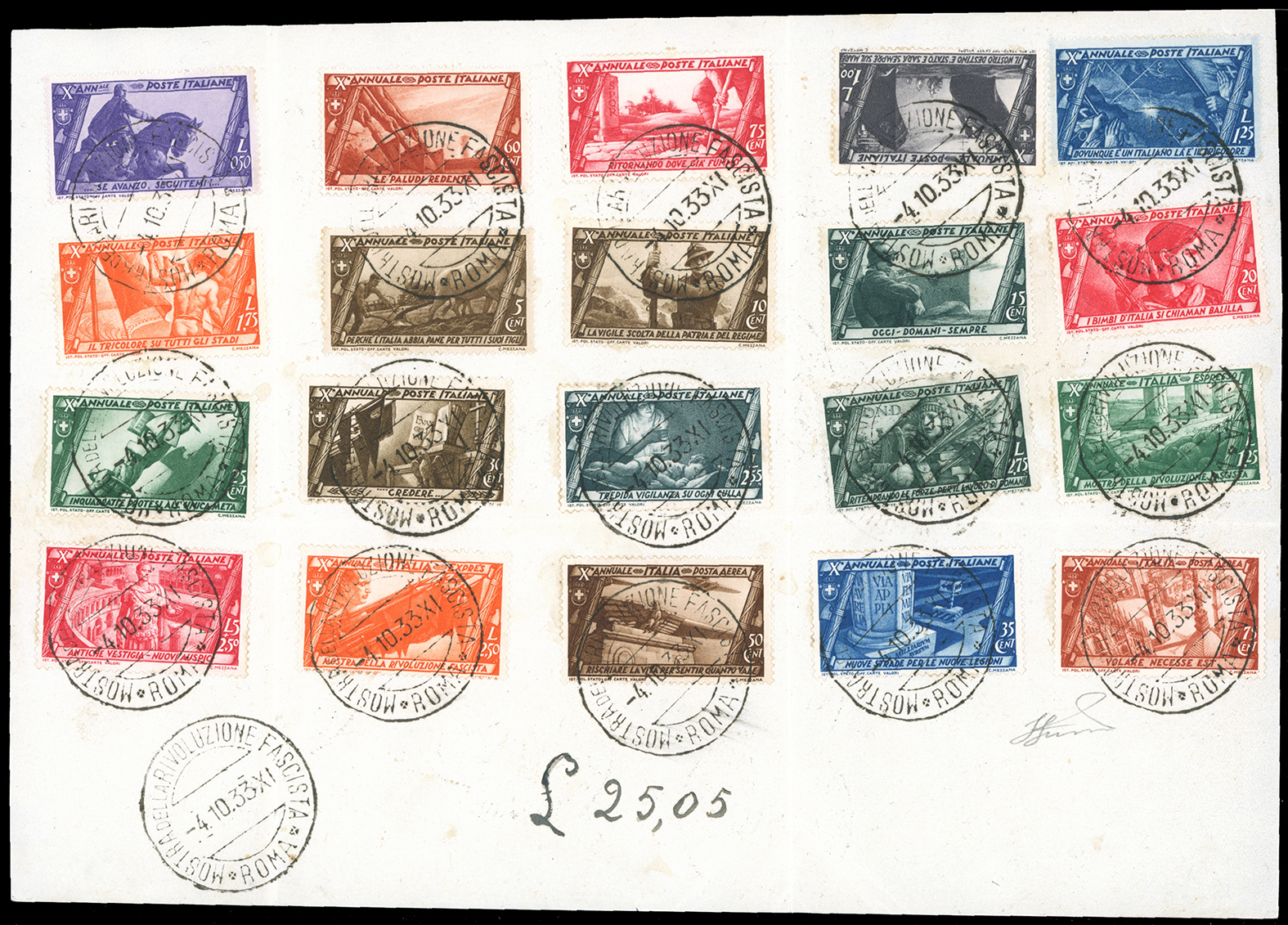 1932 - Decennale Marcia su Roma, serie completa (325/340+A+E), perfetti, usati su grande frammento con annullo speciale "Mostra della Rivoluzione Fascista 4/10/1933 Roma". Insieme raro. Ferrario.