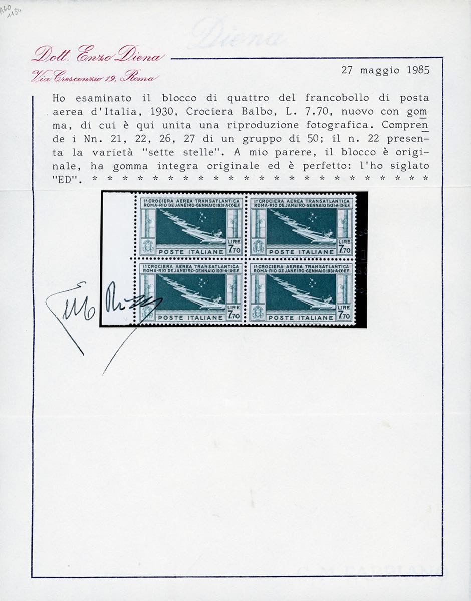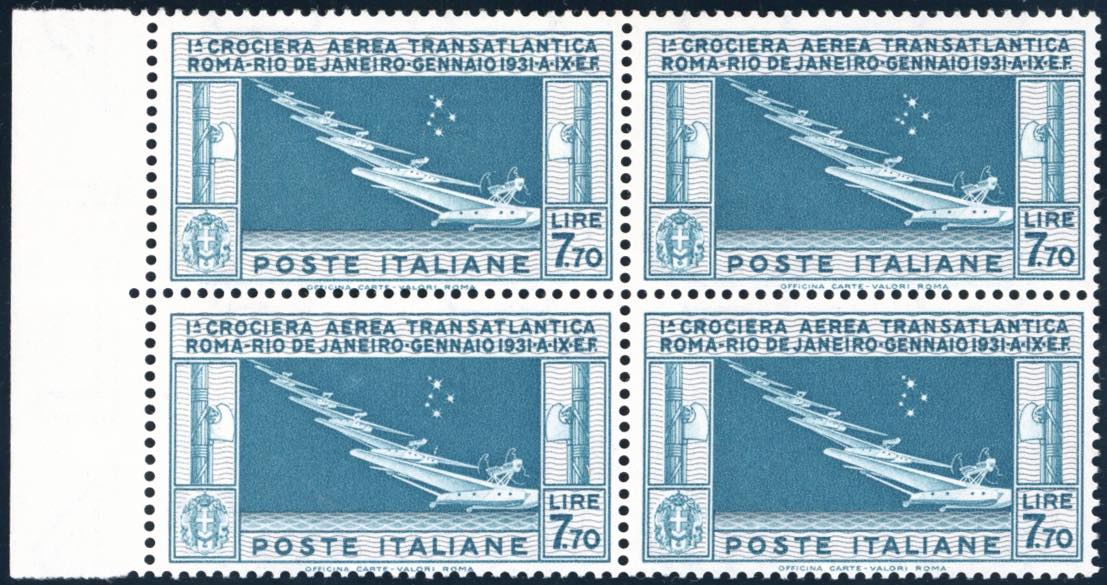 1930 - 7,70 lire Crociera Balbo, blocco di quattro comprendente un esemplare con la varietà "SETTE STELLE" (25A,25), ottima centratura, bordo di foglio, gomma originale integra, perfetto. Raro e di ottima qualità. G.Bolaffi, A.Diena, cert. E.Diena.