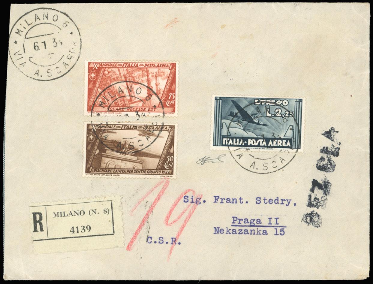 1934 - Aerogramma raccomandato, da Milano 6/1/1934 a Praga, bollo d'arrivo, affrancato con serie completa di posta aerea Decennale e 2,25 ... Read more