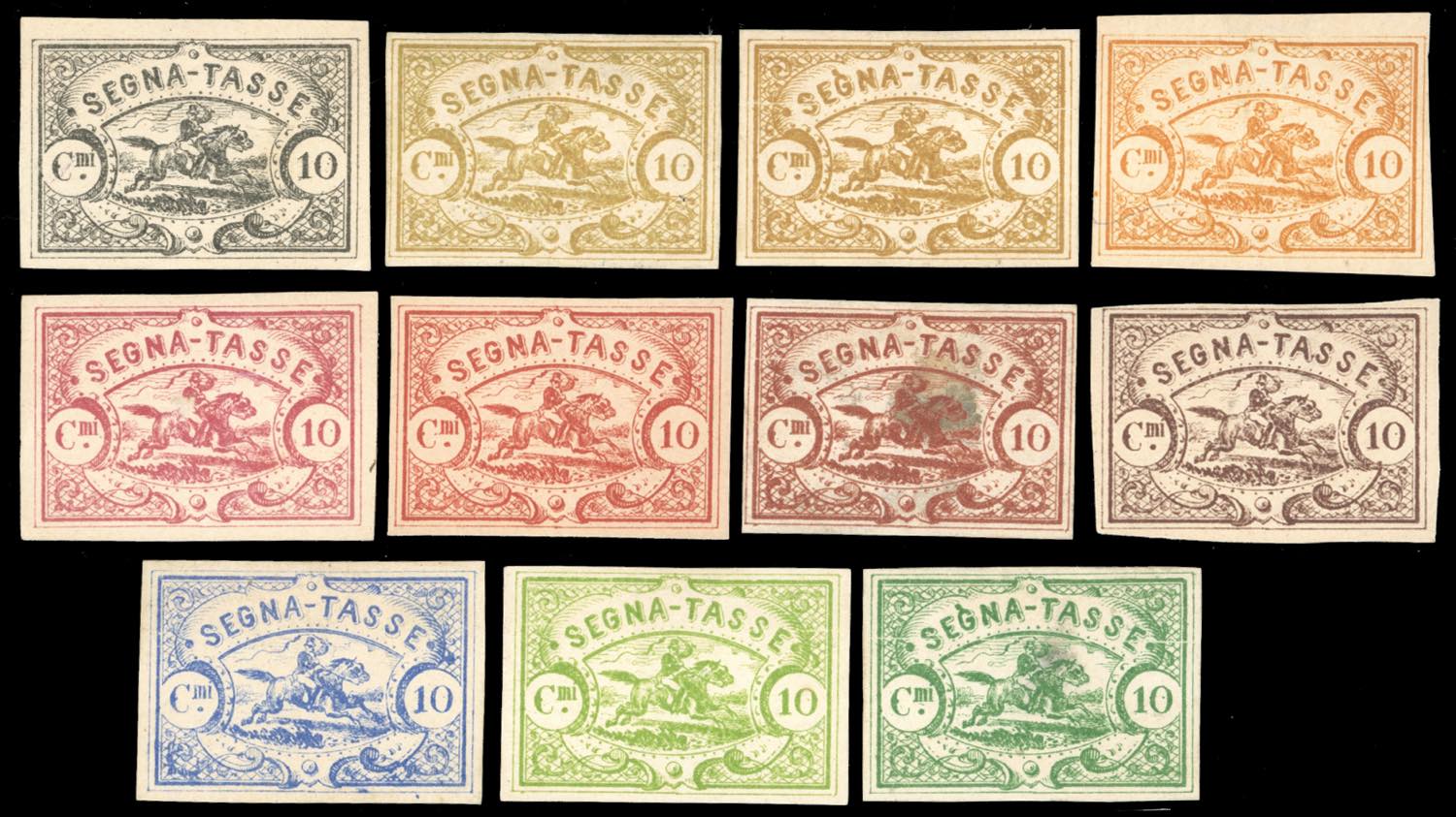 1864 - 10 cent. segnatasse Postiglione a cavallo, saggi Hummel (Unificato 53), 11 esemplari in colori differenti, senza gomma come sempre, perfetti ad eccezione di tre esemplari che presentano lievi assottigliamenti al verso. Non comune insieme. Ferrario.
