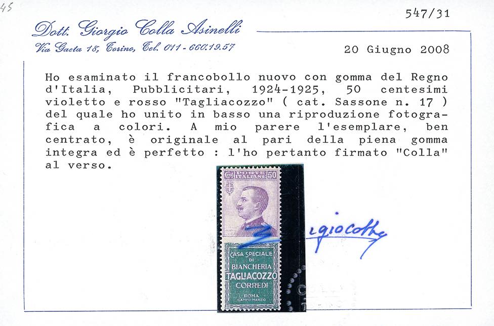 1924 - 50 cent. Tagliacozzo (17), nuovo, gomma originale integra, perfetto. Bellissimo per freschezza e centratura. Raro di questa qualità. Enzo Diena e cert. Colla.